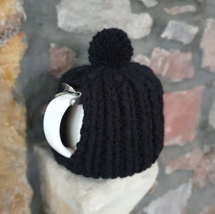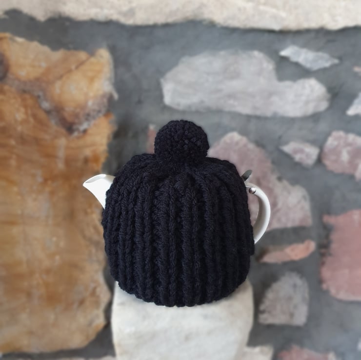 Hand knitted using double strands (two balls at the same time) of Aran weight yarn in a 1 x1 ribbed pattern, makes this cosy extra thick. It's not called a cosy for nothing!