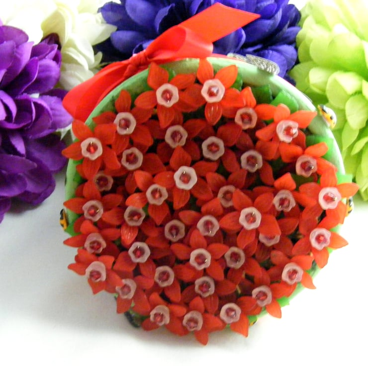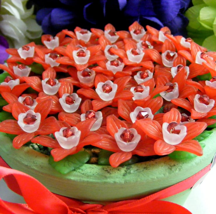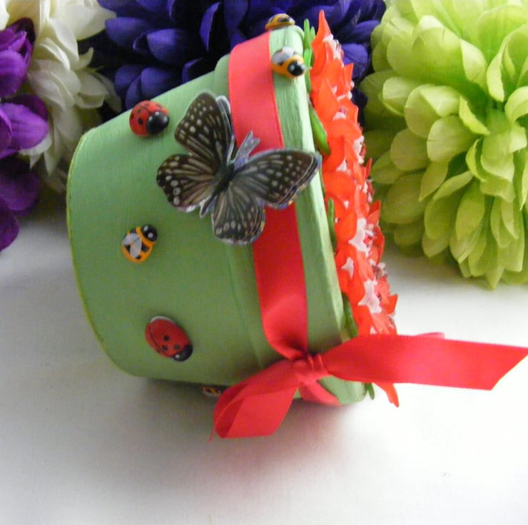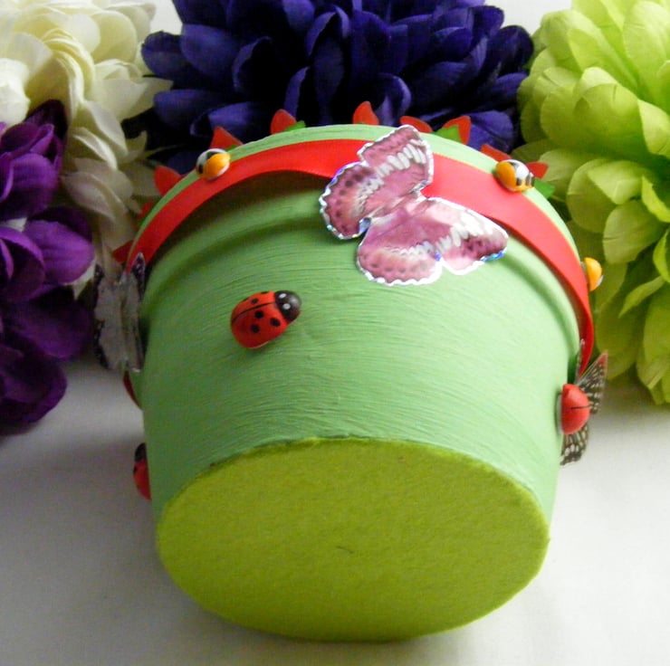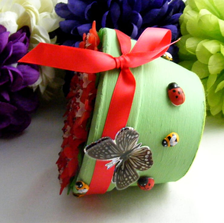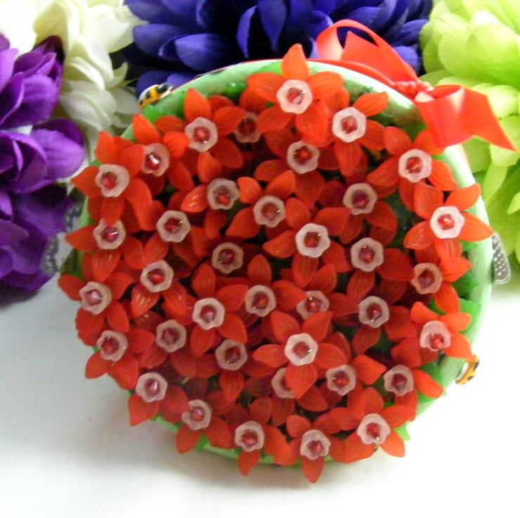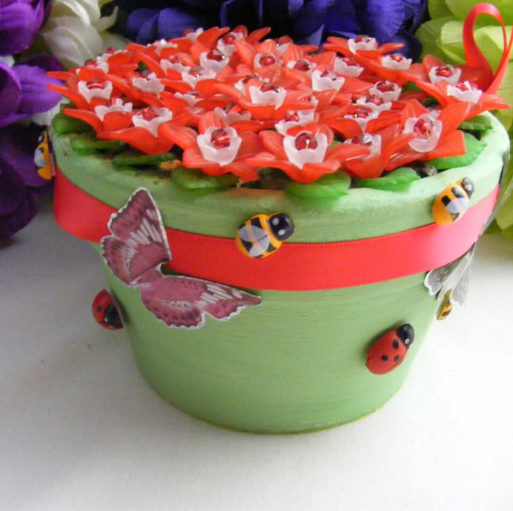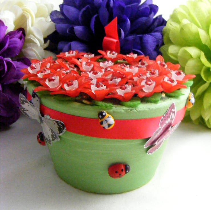 Colourful, handmade fuchsia flowers in a pot. No watering required. Perfect for gifting and displaying in any room. I've painted a terracotta pot with green acrylic paint and glued felt to the bottom of the pot. 27mm red Lucite flowers, 10mm white Lucite flowers, 5mm red acrylic beads and 15mm green Lucite leaves are all threaded onto chartreuse wire. Flowers are set in the pot with oasis and glue. Outside of the pot is decorated with, red ribbon, stick on butterflies, wooden ladybirds and bees.