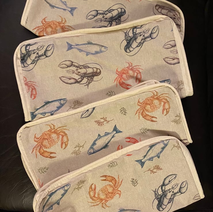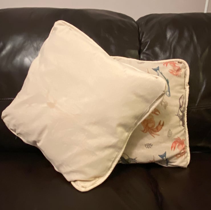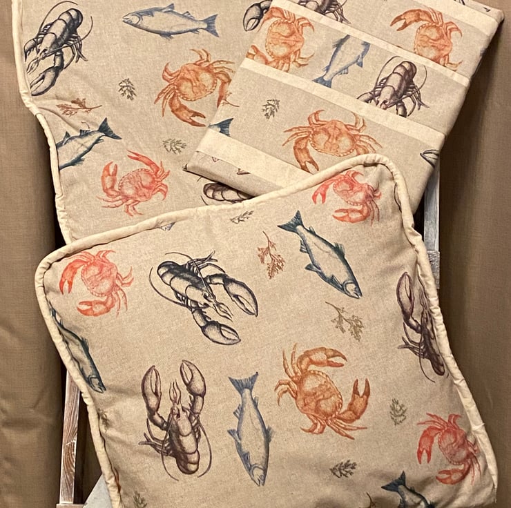 Lovely fish themed upholstery material with cream canvas backing and piping to match, with a zip opening.