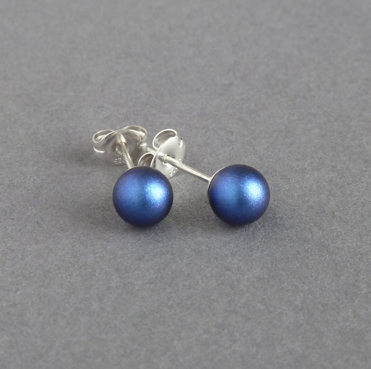This simple pair of 6mm stud earrings features a pair of Iridescent Dark Blue glass pearls. All metal fittings are Sterling silver, including the butterfly backs, which help keep your earrings securely in place.