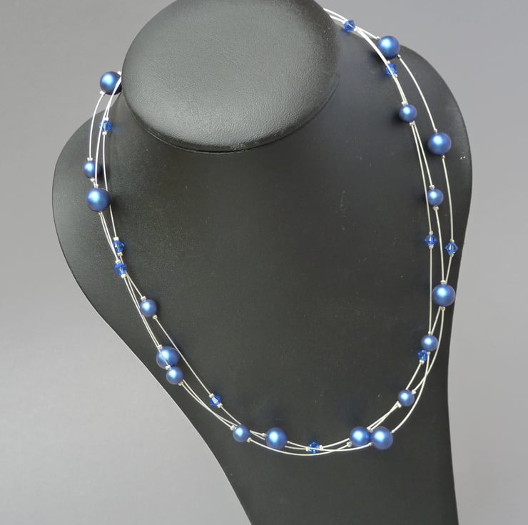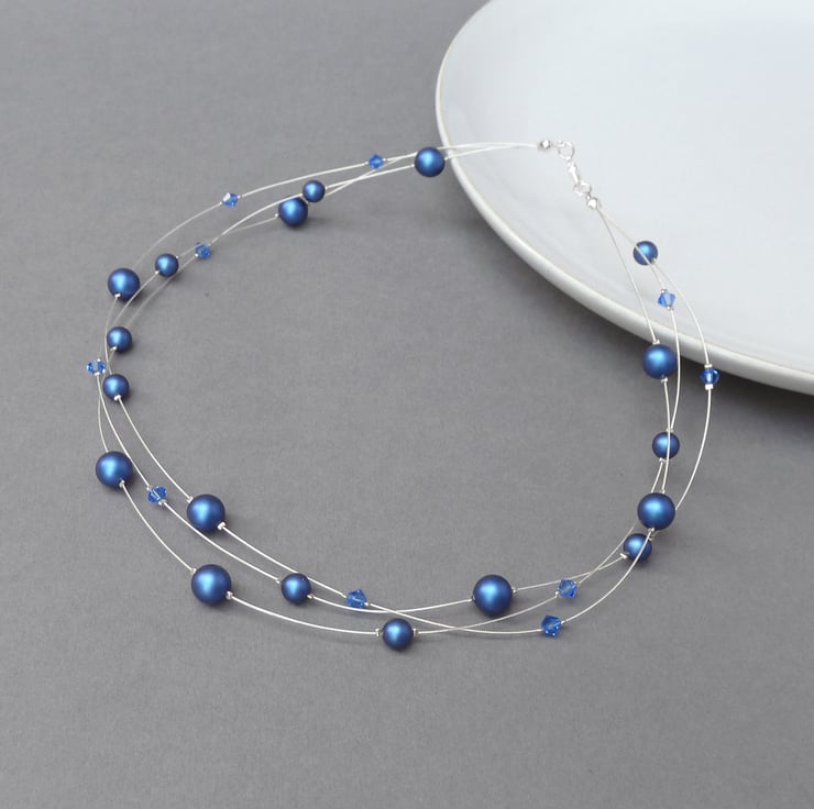 Iridescent, dark blue glass pearls pair with sapphire coloured crystals to create this royal blue, floating pearl necklace. These dark blue multi-strand necklaces make great gifts for lovers of colourful jewellery.