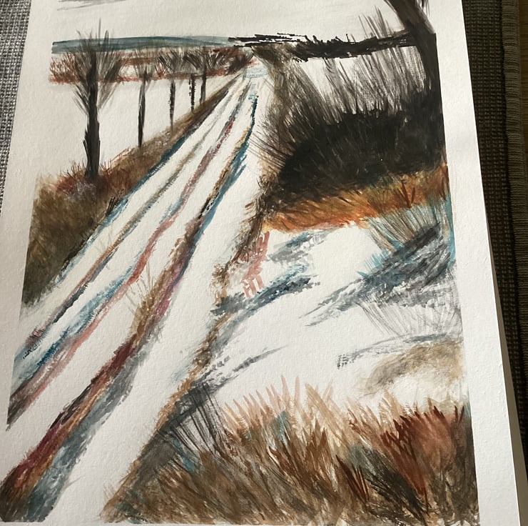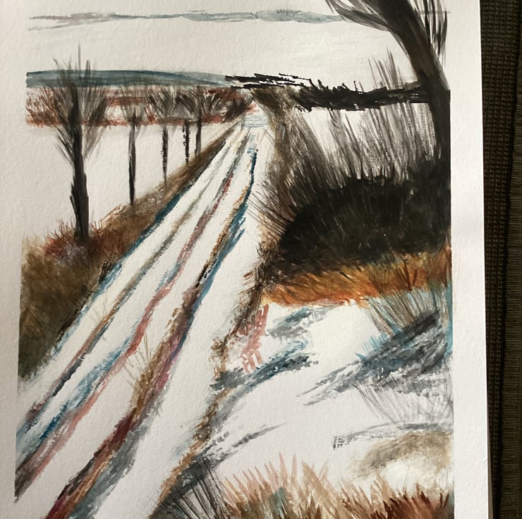 16.5.by 11.7 Rustic watercolour painting allowing the natural paper to come through creating the winter path capturing the snow covering the land , and holding out, to elements, woods and shrubbs baren and fighting back.