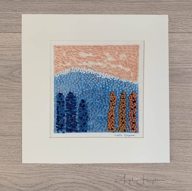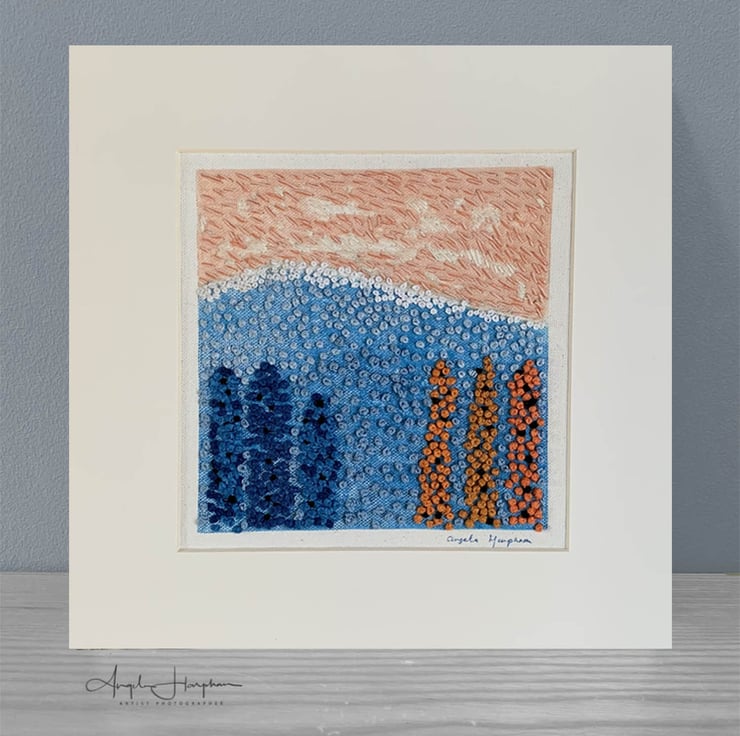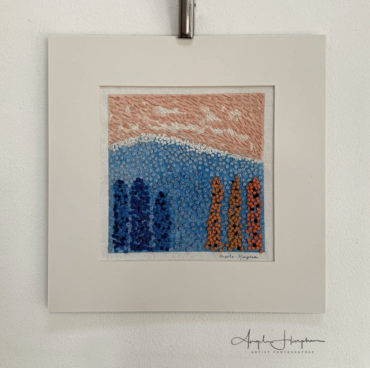 Had a few sessions printing on gessoed canvas. This landscape developed into an embroidered picture with delphinium flowers in the foreground.