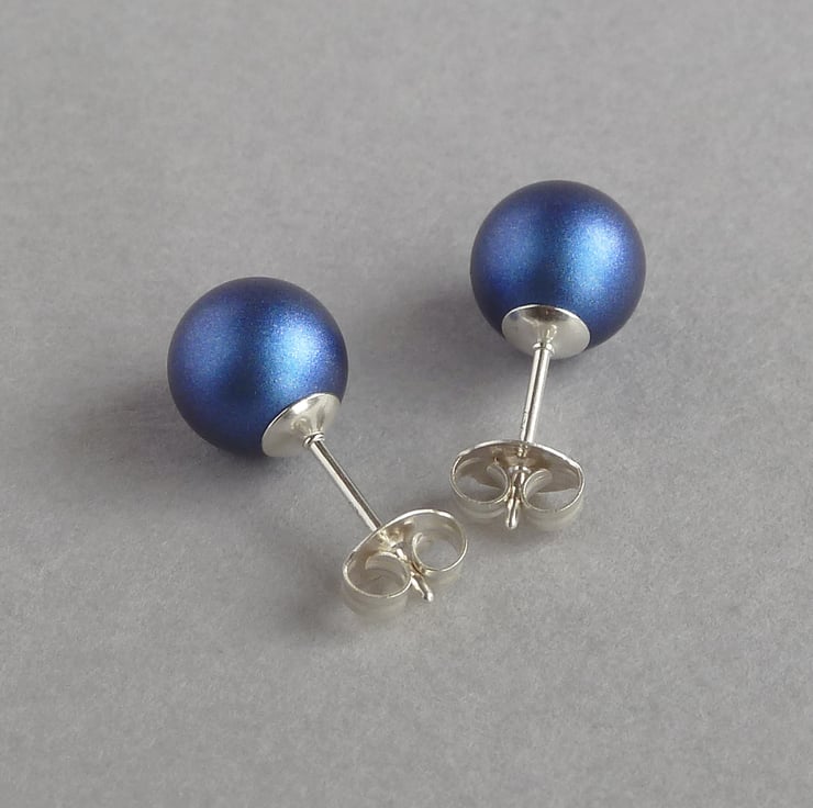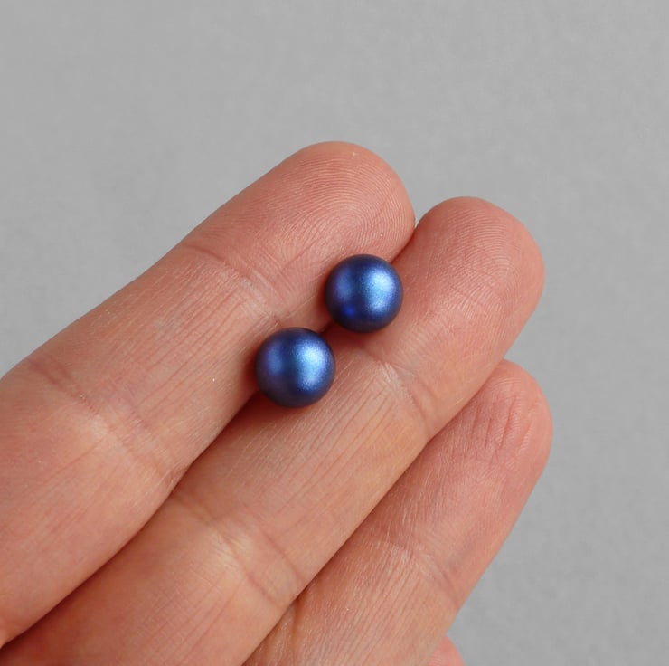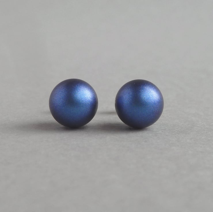 Created using 8mm Iridescent Dark Blue glass pearls, these royal blue pearl studs are perfect for wearing everyday. The iridescent finish of the coloured glass pearls gives each pearl a metallic, glitter like finish. Each pair of simple stud earrings comes individually gift wrapped, making these round, dark blue studs the perfect gift for bridesmaids or that special somebody.