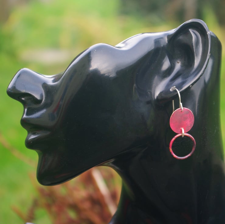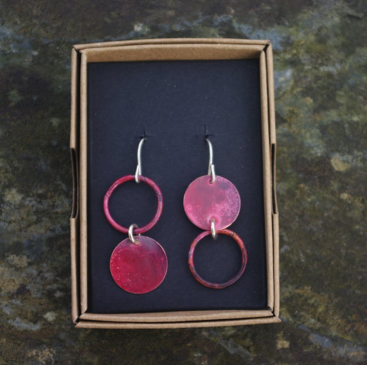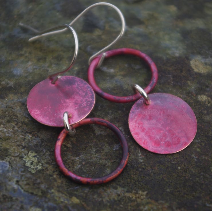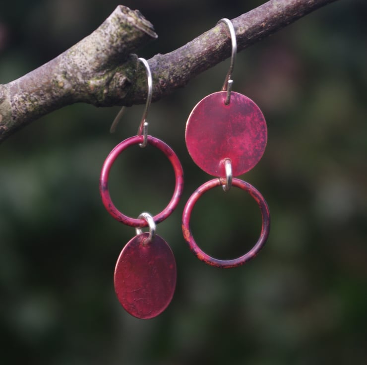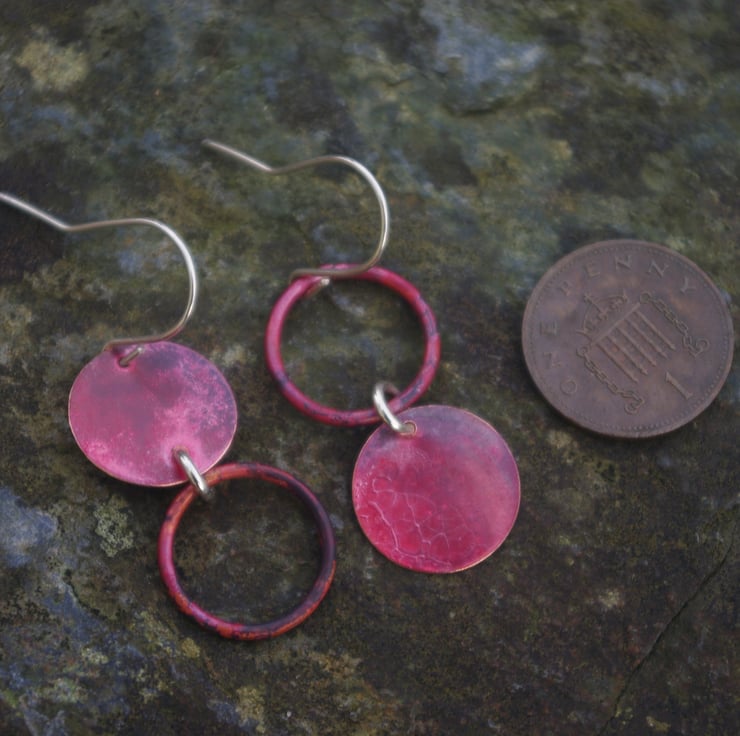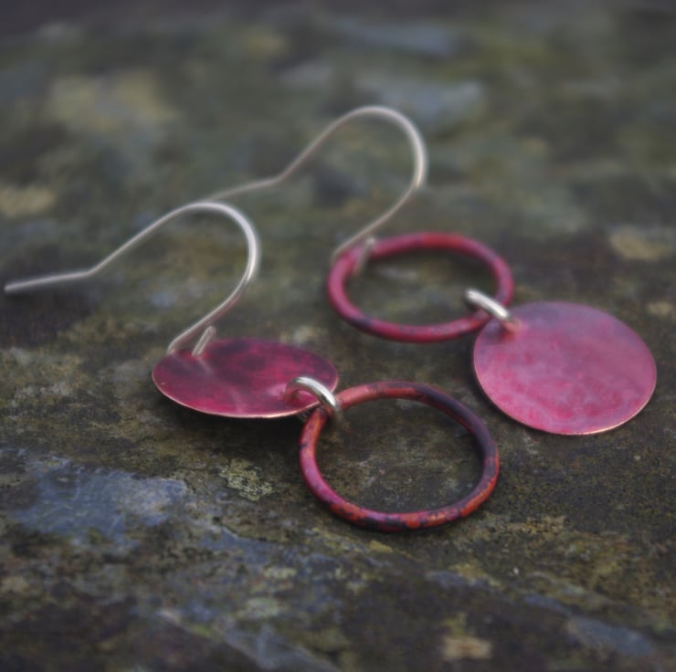 Mismatched copper discs and copper hoops earrings. I have treated the copper with heat to produce lush red , orange and purple tones . These colours are permanent and are preserved with a penetrating wax.The circles are all 16mm/ just over half an inch in diameter and joined together with sterling silver jump rings .They are light to wear and have a length of 45mm/ nearly 1.75 inches.