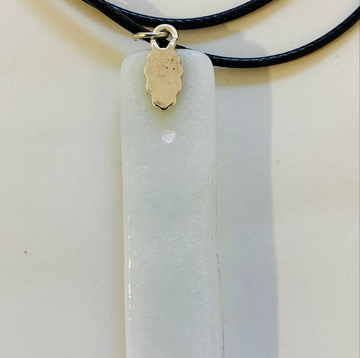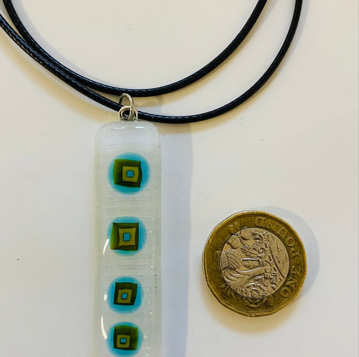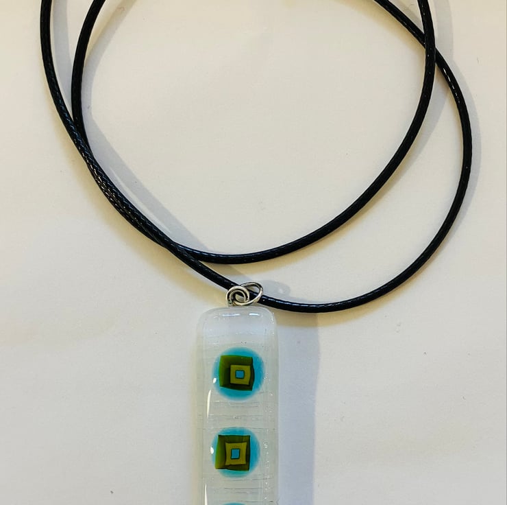 A beautiful fused glass pendent , handmade in my studio , and finished with a waxed cord necklace.