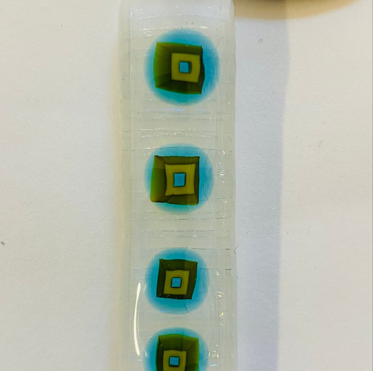 My pendants are made using bullseye fusing glass and every piece is uniquely made by hand. They are then fired in my kiln to fuse the glass together into one beautiful piece.