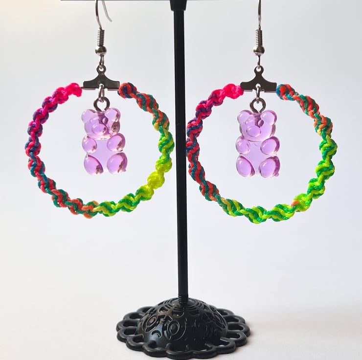 These macramé hoop earrings are hand knotted on silver coloured hoops in this rainbow colour cord.