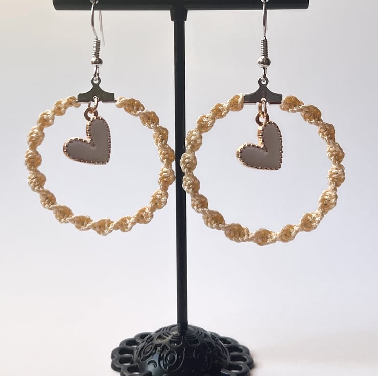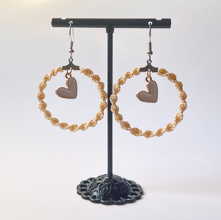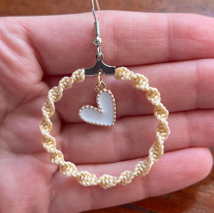 These macramé hoop earrings are hand knotted on silver coloured hoops in gold cream colour cord. They are further embellished by small heart pendants for that extra classy and romantic look.