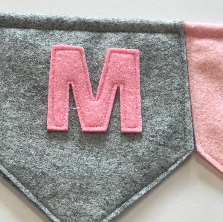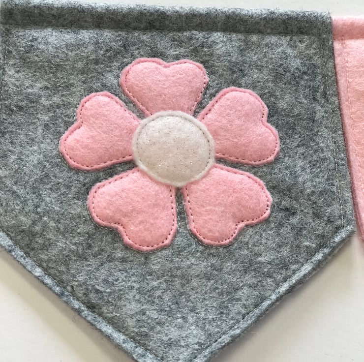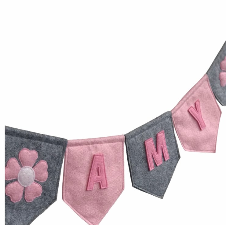 This luxury bunting is personalised with any name you choose, making a really pretty name banner for a nursery or girls bedroom. Each flag is made from wool felt in pretty pink and grey combination with end flags of pink flowers. Each felt letter is sewn on so no risk of them coming off. A lovely gift for a baby shower, new baby or a little girl, beautiful decor which will be a lovely keepsake named garland for years to come