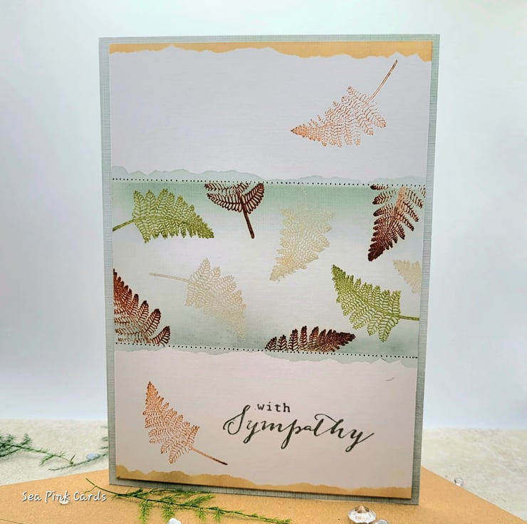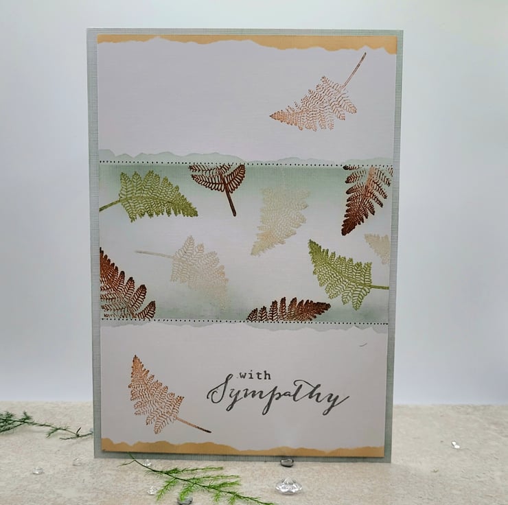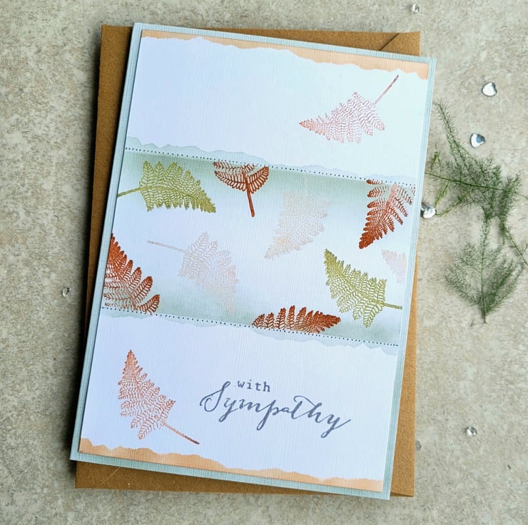 A handmade sympathy card with a delicate, tranquil fern design, in natural tones of sage green, light green and warm brown tones, with a white background. With Sympathy is stamped on the front in grey ink and the inside of the card is blank, with a small single green fern in the lower right hand corner. The card measures 12.5 x 17.5 cms and comes with a 100% recycled brown kraft envelope.