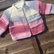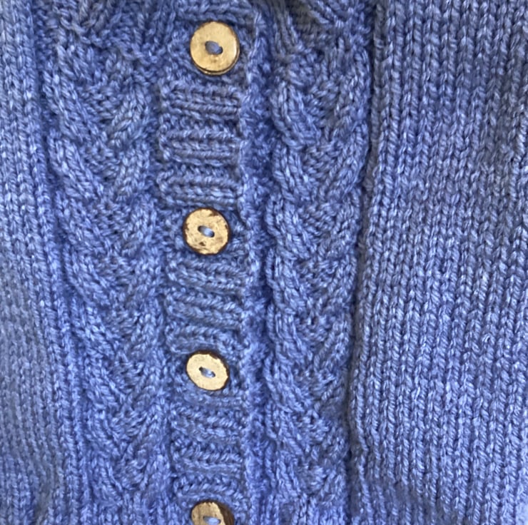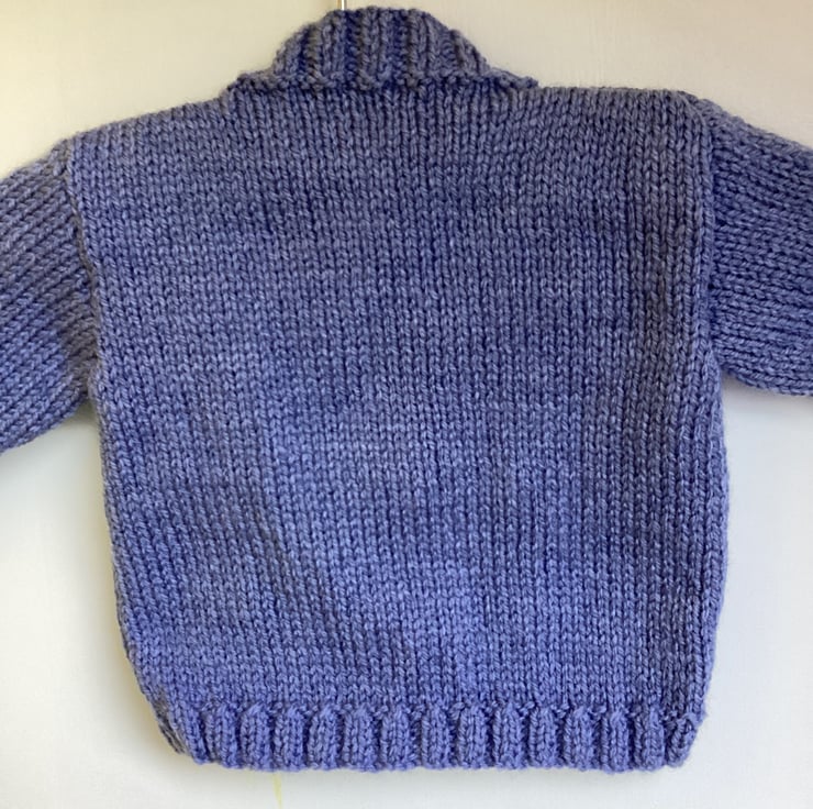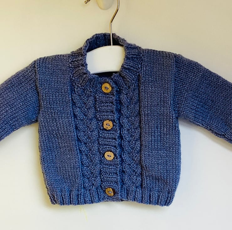 Lovely hand knitted baby cardigan in a gorgeous stonewashed denim blue shade. Fastens with four coconut shell buttons. The yarn I have used is a good quality, easy care soft acrylic baby yarn and will suit either a boy or girl up to six months approximately. Perfect as an extra layer for a little one and will complement many outfits.
