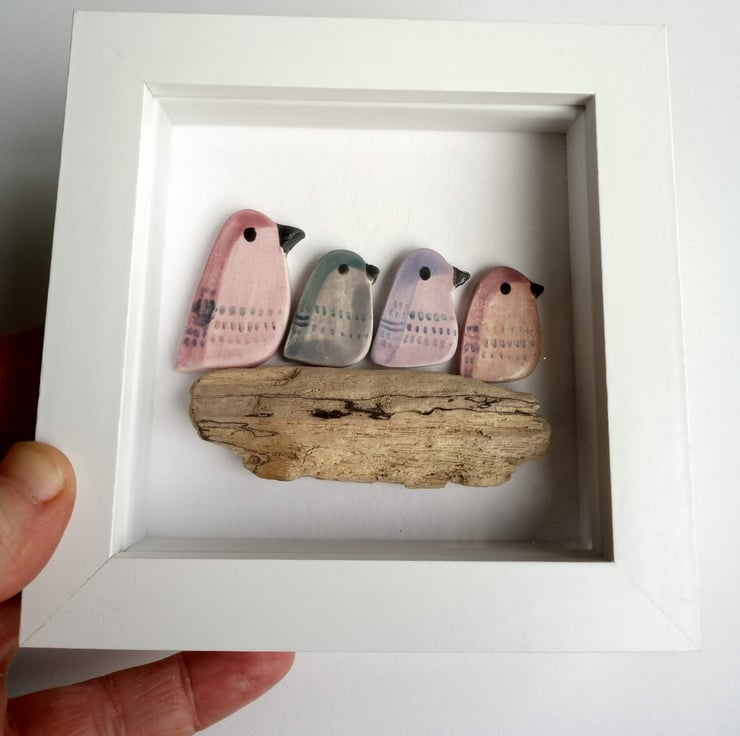This is a very cute set of 4 birds, glazed in pinks, mauves and purples all sitting on a piece of driftwood. They are mounted on thick quality paper and sit in a white box frame.