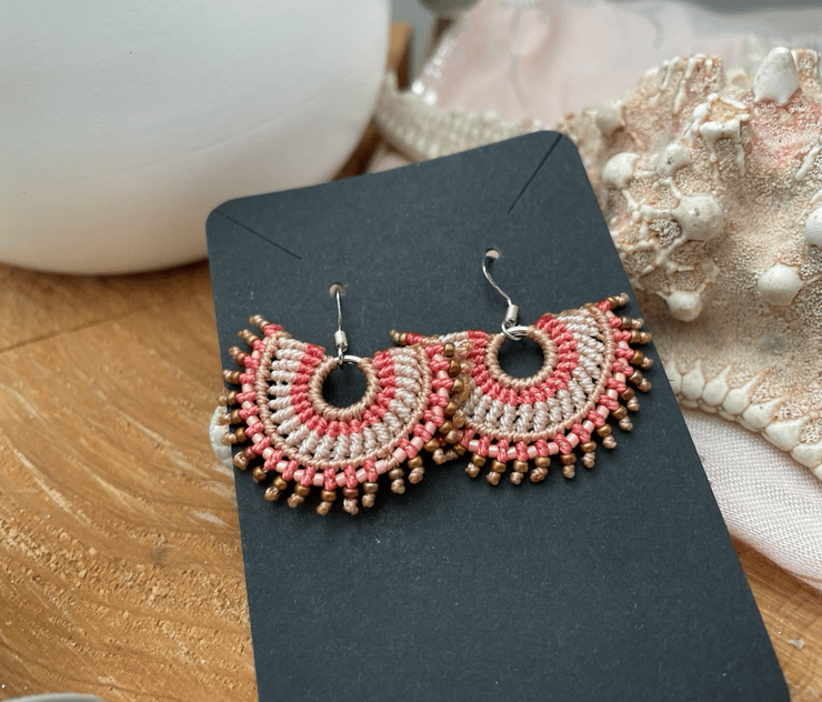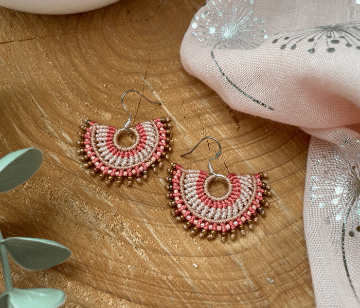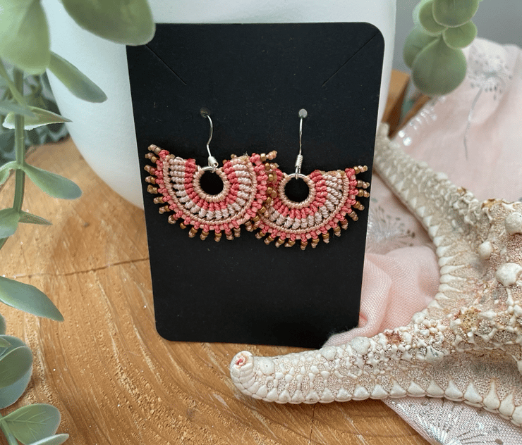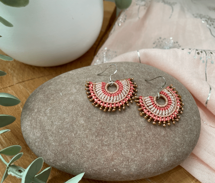 I have created these earrings using the intricate knotting art of macrame, using extremely strong C Lon thread in pretty colours of peach and coral . Tiny glass Miyuki seed beads have been threaded into the design to add a little bit of sparkle.