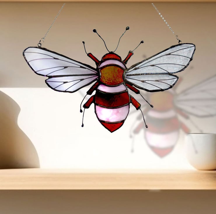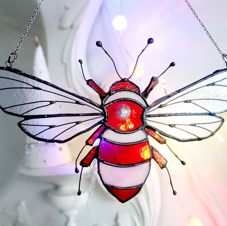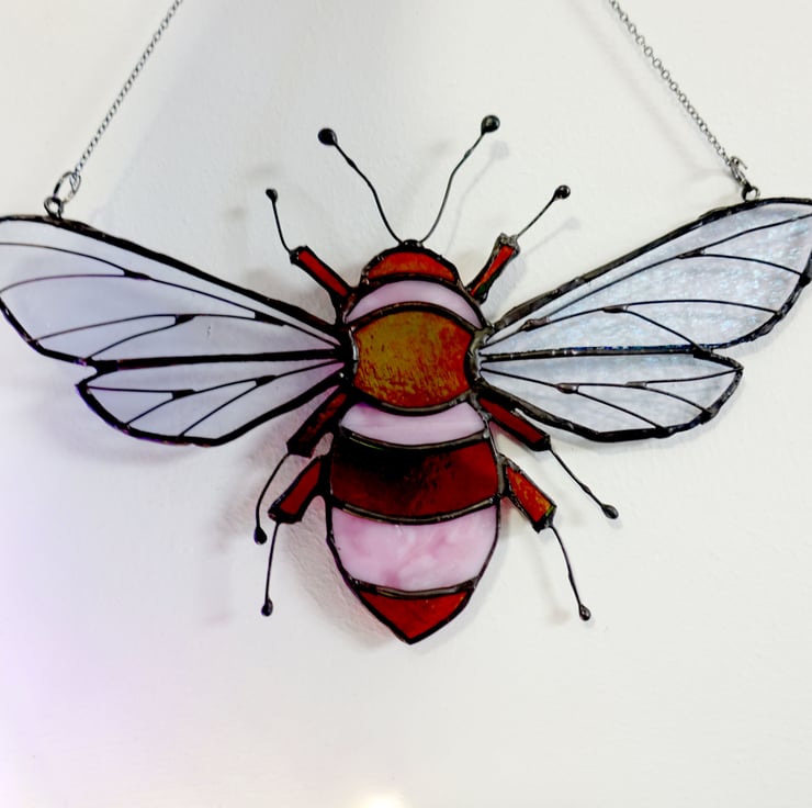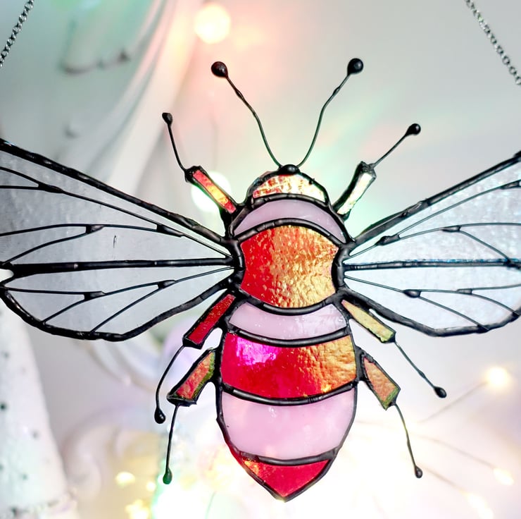 Meet Josie! Lovely stained glass Queen Bee made from a mix of pale pink ring mottle glass and cerise striker glass with a rainbow patina. The veining on Josie's wings is copper wire and the patina finish is black.
