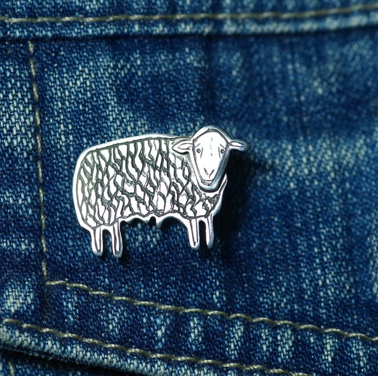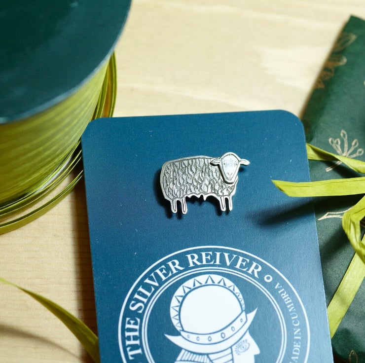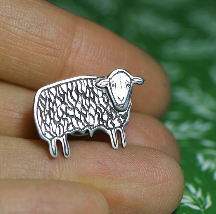This little Herdwick Sheep pin has been hand cut from 100% recycled .925 Sterling silver sheet, soldered together using traditional silversmithing techniques, filed, polished, and carefully engraved. It has a metal pin soldered to the back, and a butterfly clasp to close.