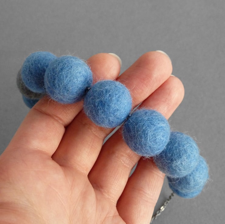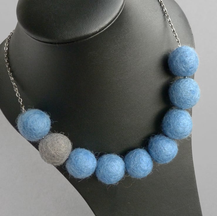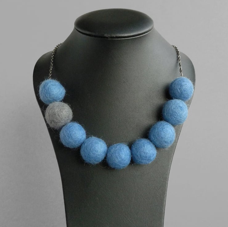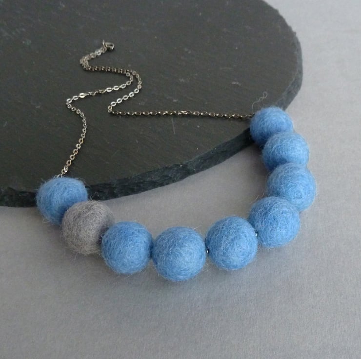 Dusty blue, felted balls are punctuated with a single, grey ball and spaced with tiny, glass beads to create this chunky denim blue felt necklace. This mid-blue, statement necklace is a great way to add a splash of colour to an outfit.