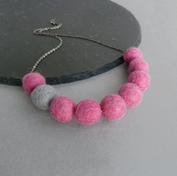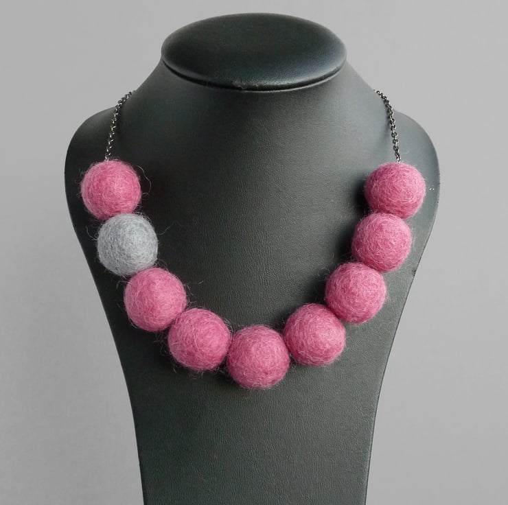 This chunky, raspberry pink, felt necklace would make a great gift for women who love to add a pop of colour to an outfit with a statement necklace. Each felted ball necklace is created using dark pink and grey felt beads.