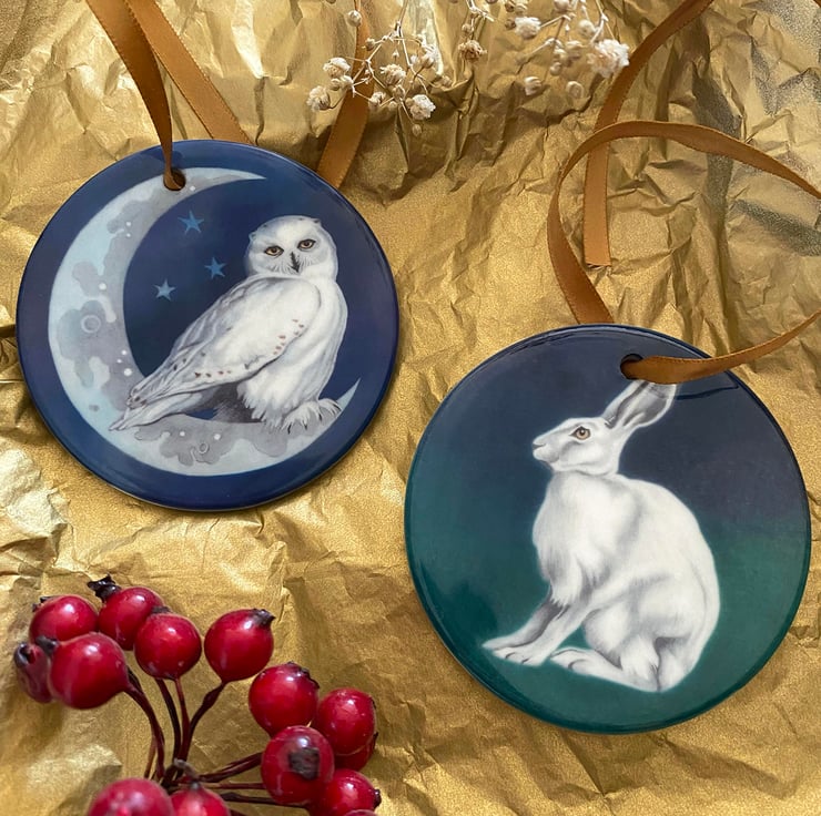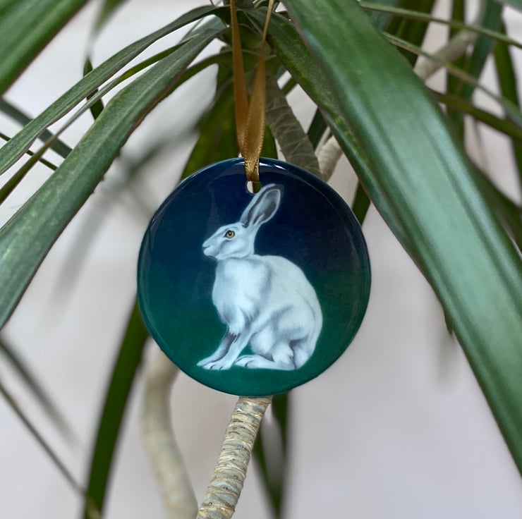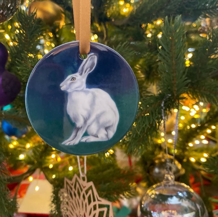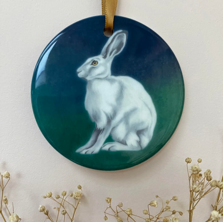 This beautiful glossy, circular, flat ceramic tree ornament shows off my elegant White Hare illustration beautifully. I created the original artwork using a combination of pencil, chalk pastel and digital work.