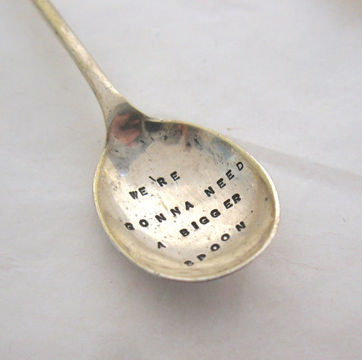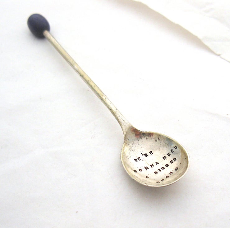 We're almost certainly gonna need a bigger spoon than this one. It's a dinky vintage coffeespoon a mere 10.5cm long. It has a purple plastic (celluloid?) coffee bean on the end of its handle, it's silver plated and in its tiny oval bowl I have stamped in tiny letters WE'RE GONNA NEED A BIGGER SPOON. This was a prototype and not a terribly successful one, the apostrophe is pointing the wrong way for a start, so into the bargain bin it goes and you have the chance to pick up one of my 'uniquely characterful' (that's artyb-llocks for 'unplanned and somewhat wonky') handstamped spoons for the price of a posh coffee.