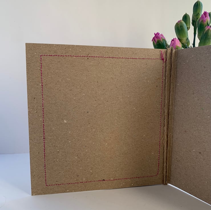 The hessian is machine stitched using a contrasting thread, onto a plain brown recycled card. This stitching is visible on the inside of the card.