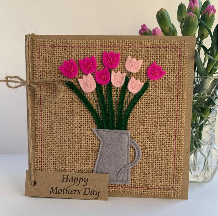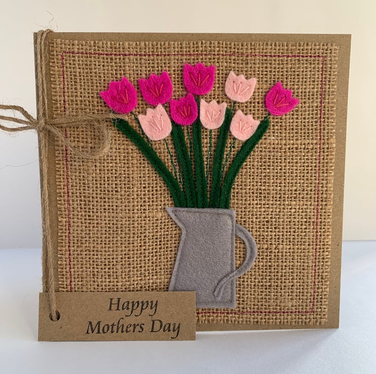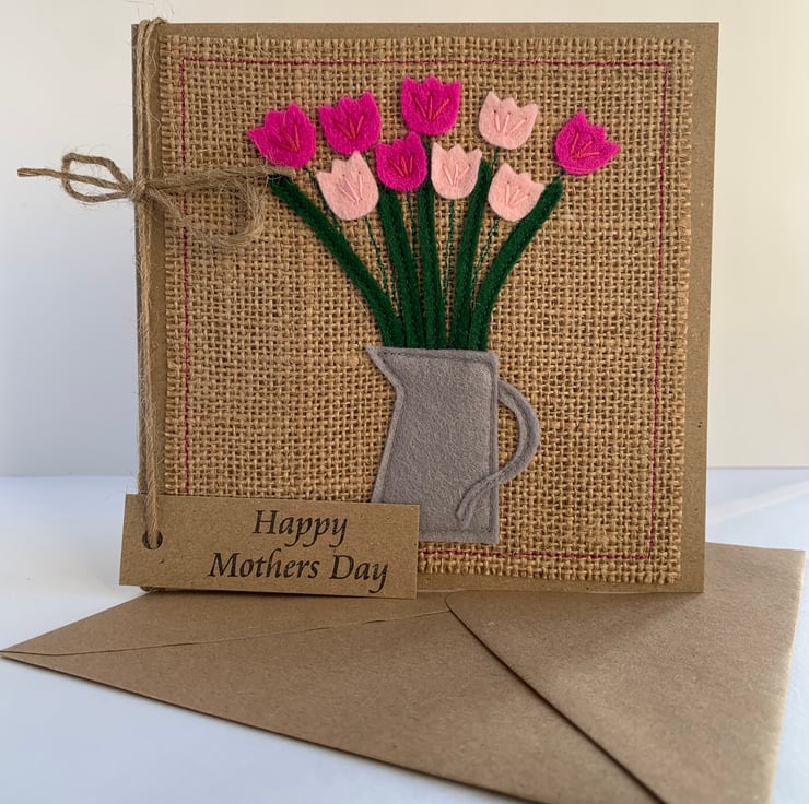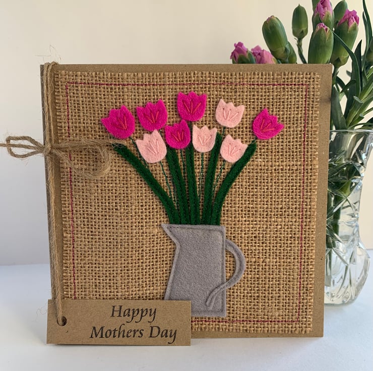 A handmade Mother’s Day card decorated with fuchsia and pale pink flowers in a pale grey jug.