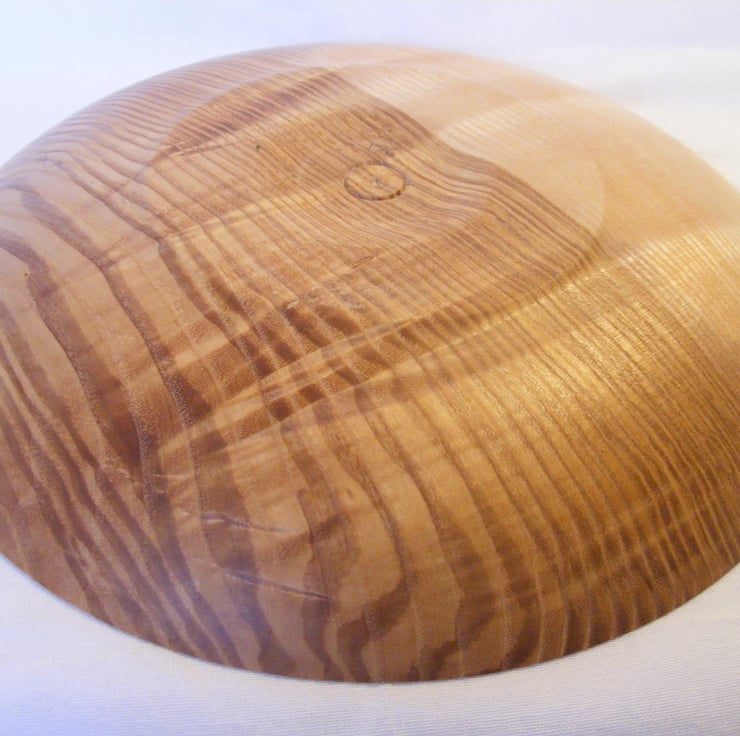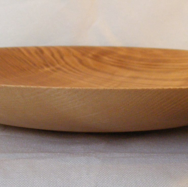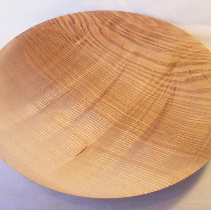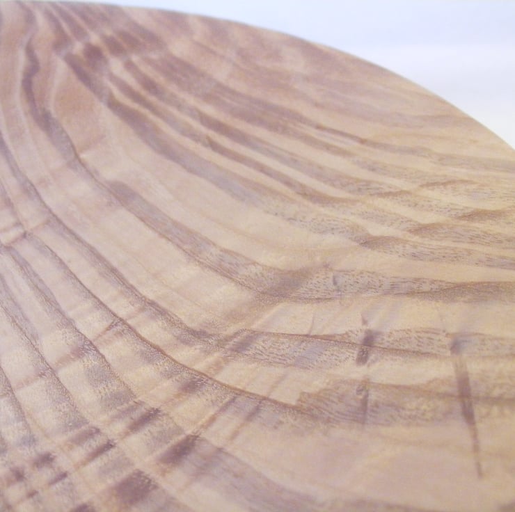 Rippled Ash platter, 266 x 38mm (26.6 x 3.8cm) A nice rippled Ash platter, a gently curving rimless design that shows off the amazing rippled and brown heart grain of the Ash. The colours range from golden brown to milk chocolate, the ripple gives an almost 3D affect in the light. Food Safe and ideal for serving.