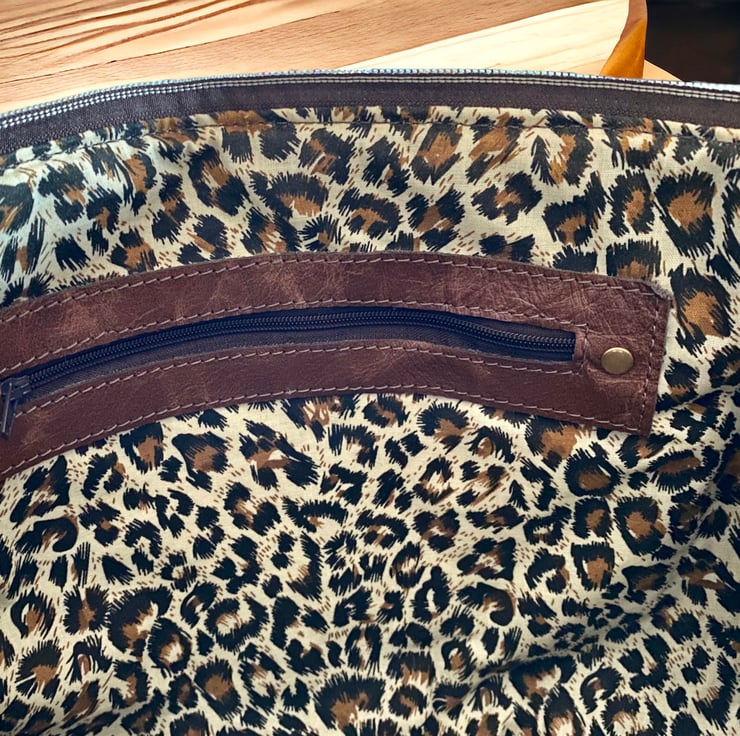 She’s a mid sized bag, with gold coloured hardware, a wide zipper opening and a leopard print cotton interior lining. Inside, there’s a leather trimmed slip pocket and a leather trimmed zipper pocket.