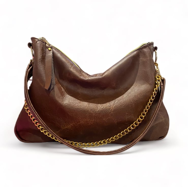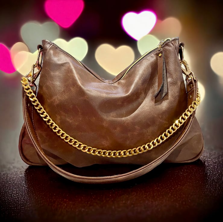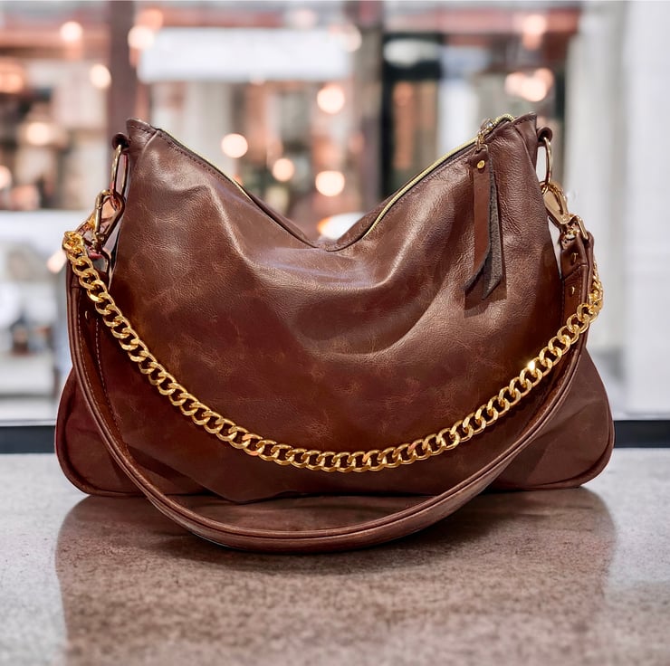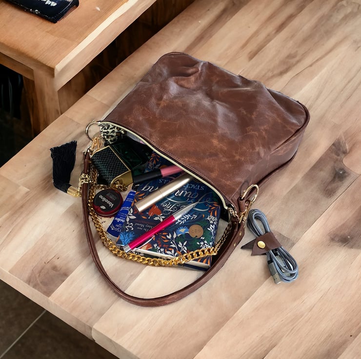 This bag is made from the ‘Paulette’ pattern by Shamballa Bags. I absolutely love this design! It’s a great ‘grab and go’, slouchy bag and is made from a haul of leather that was rescued from a factory that uses leather in it’s manufacturing process - this leather was headed to landfill, but not any more! Now she’s going to join me in a happy dance when someone purchases, before I send her out into the world to join her new owner.