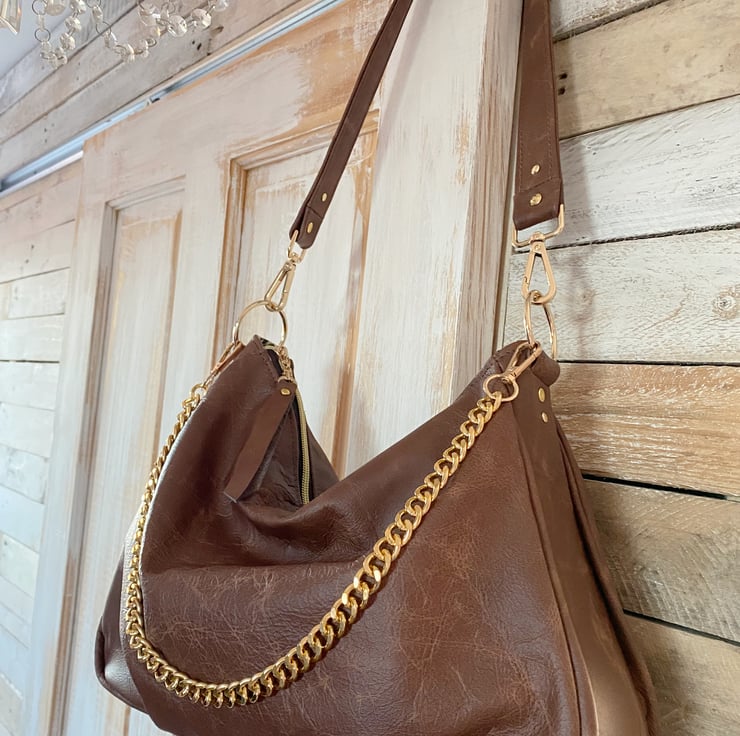 Now… let’s talk about those gorgeous straps! You have two removable straps - one riveted leather strap and one gold chain strap. Gorgeous!