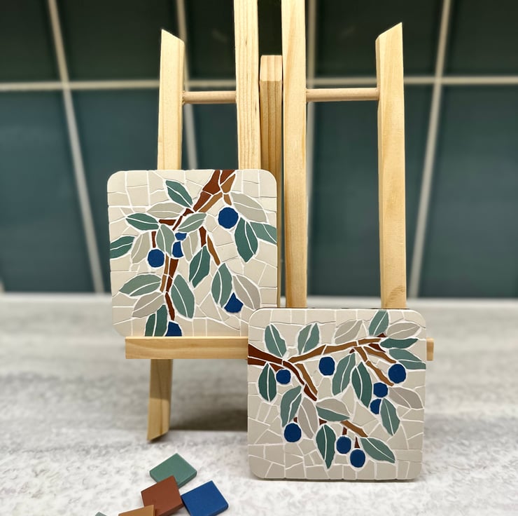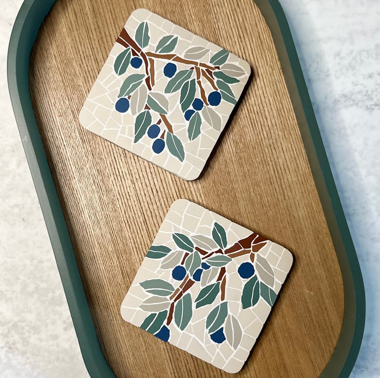 Two elegant, unique mosaic coasters that feature an Olive Branch design in shades of green and silver with stylized dark blue olives.