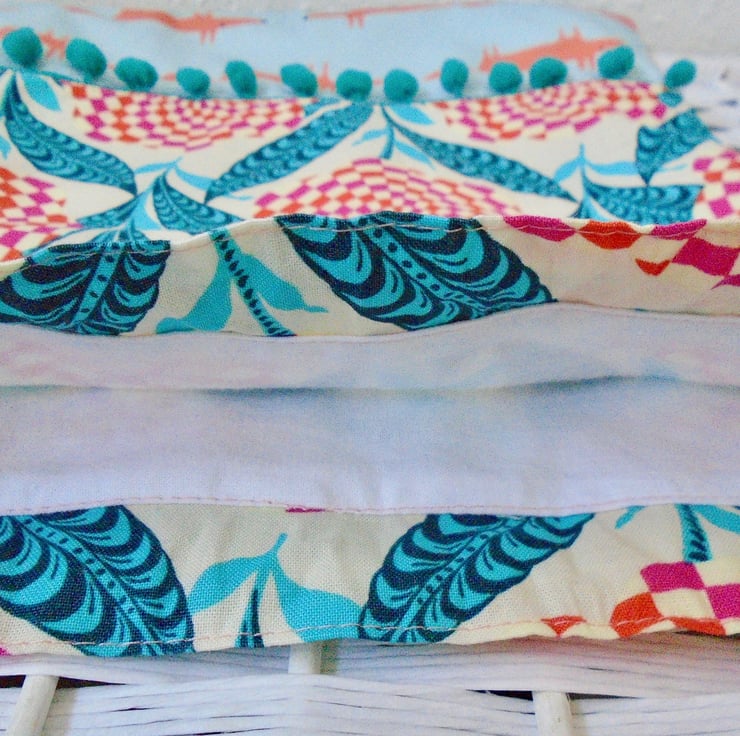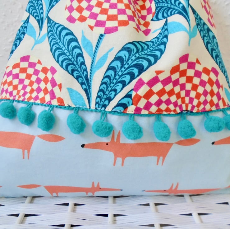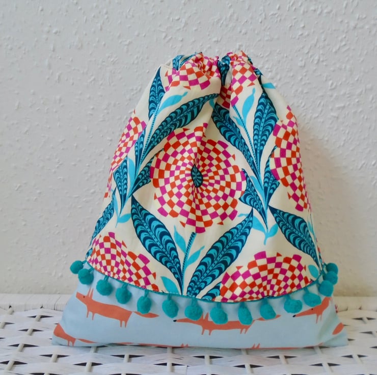 Made in a couple of lovely printed cotton fabrics , and embellished with pom pom trim on the front