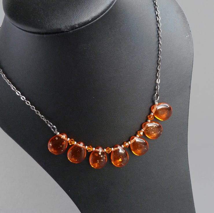 Perfect for brightening any outfit, this vivid orange, fan necklace makes the perfect gift for lovers of colourful jewellery. Each bright orange necklace is made using Czech glass teardrops, separated by sparkling crystals. The vibrant glass beads are speckled with gold flecks.