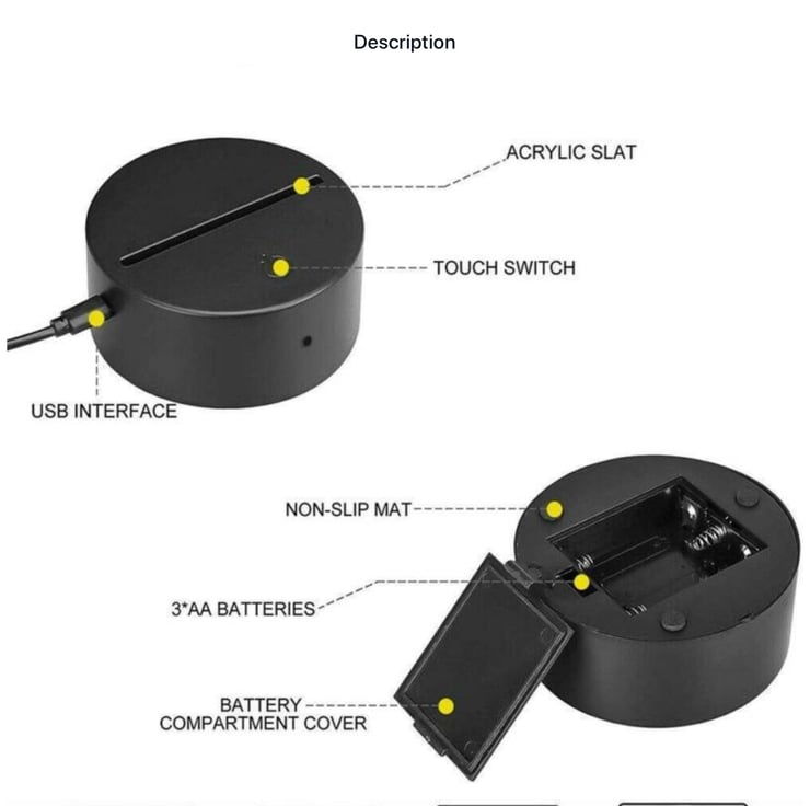 The LED light base is powered by 3 x AA batteries ( Not included) or the USB cable provided.
