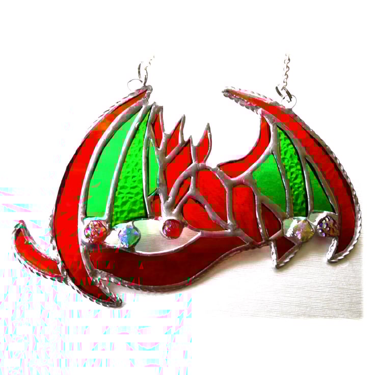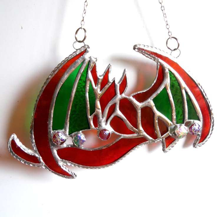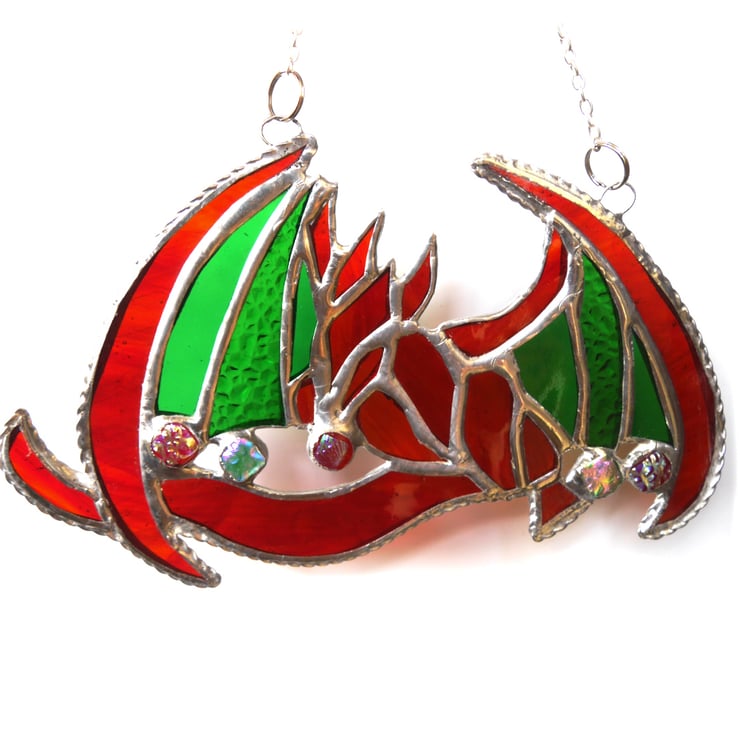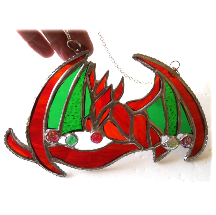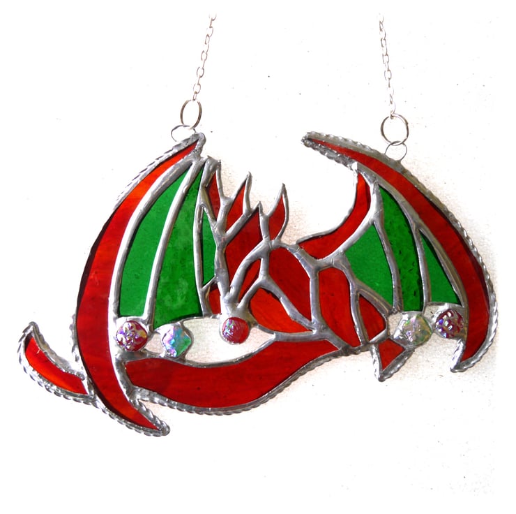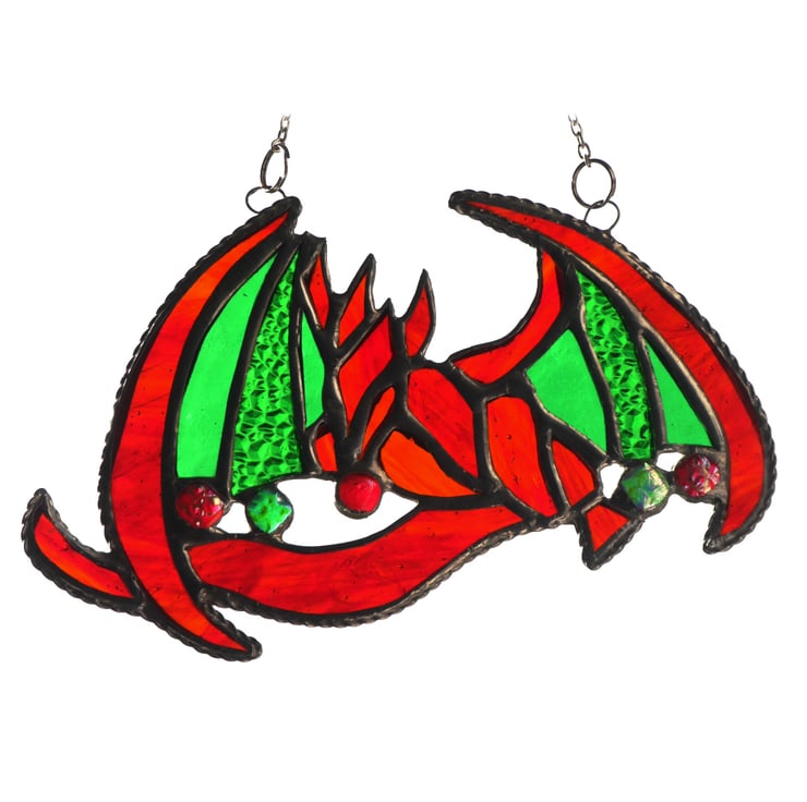 The dragon is cut from red and amber gorgeous glass and has wings in two shades of bright green. It is carrying 4 rare dragon eggs along the flaps of its wings and a smouldering red ball of fire in its mouth.