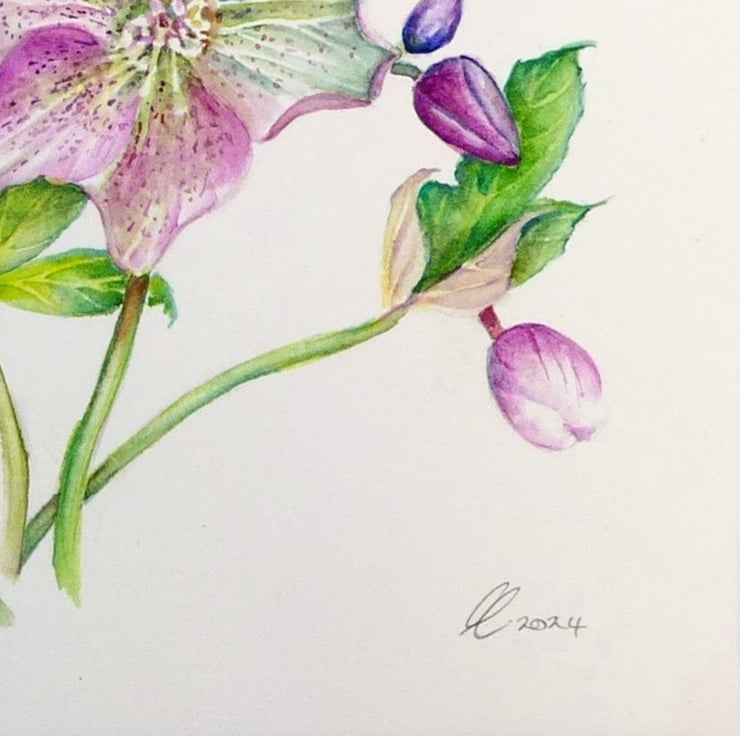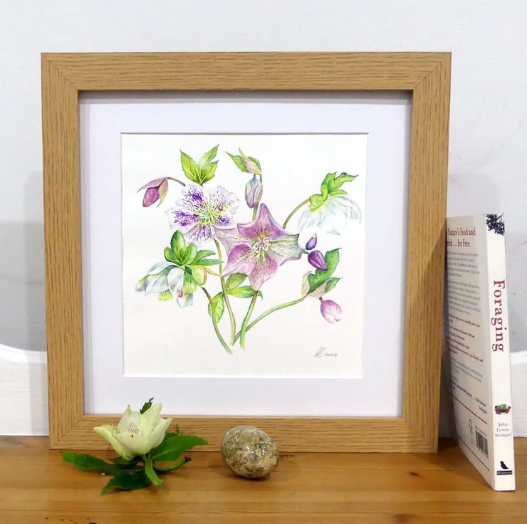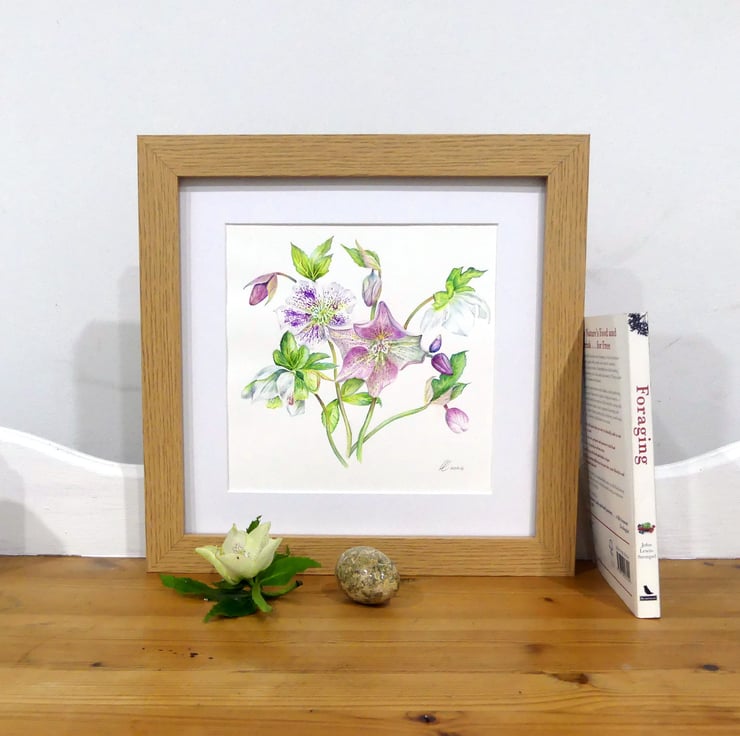 A framed modern botanical watercolour painting of the magical hellebore. I have always been enthralled since a small child by these flowers that grew in quiet corners of the garden and popped through the leaf litter so early in the year. Their use in witchcraft as a hallucinogen is comparable to the mandrake.