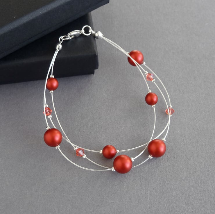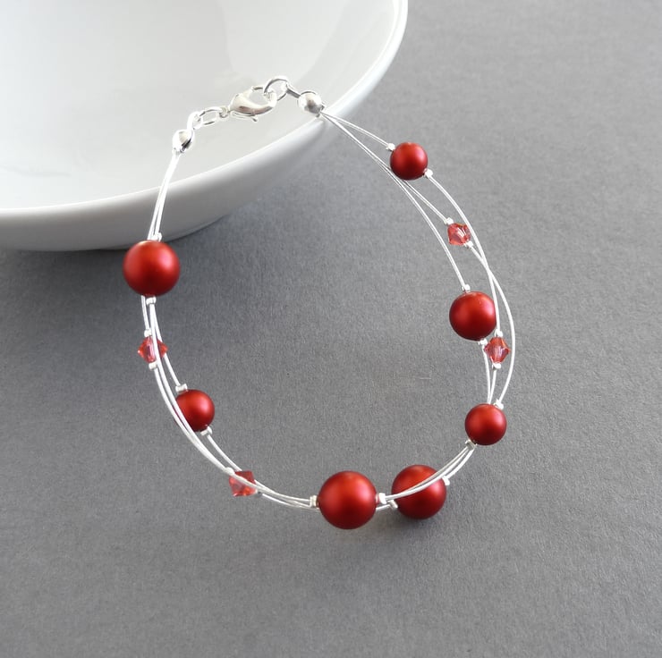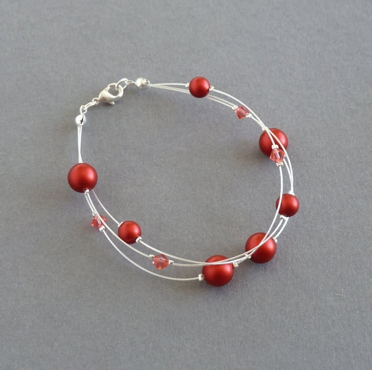 Bright Red Floating Pearl Bracelet - Dainty Christmas Red Multi-strand Bracelet