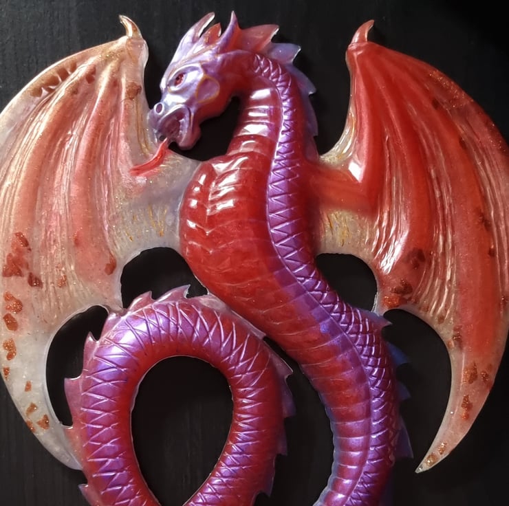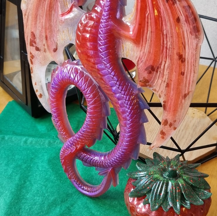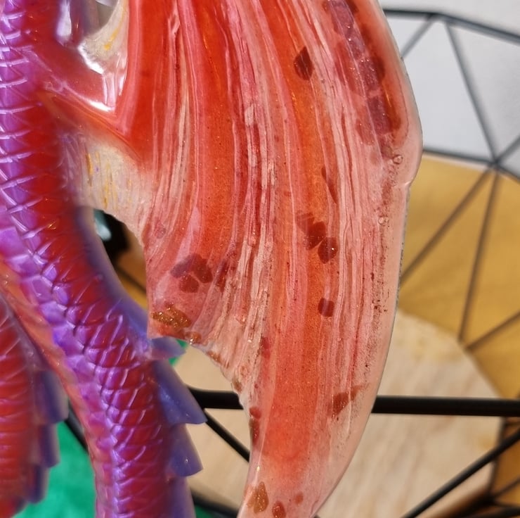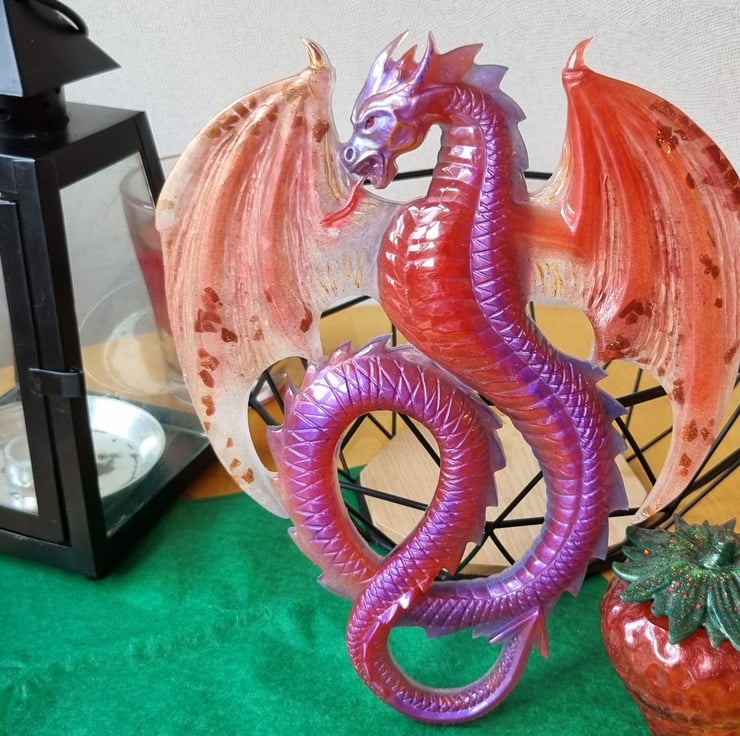 This dragon has been made from professional grade resin, several colours have been included using mica powder and there are some firestone gems in the wings. The finishing details have been applied using acrylic paint.