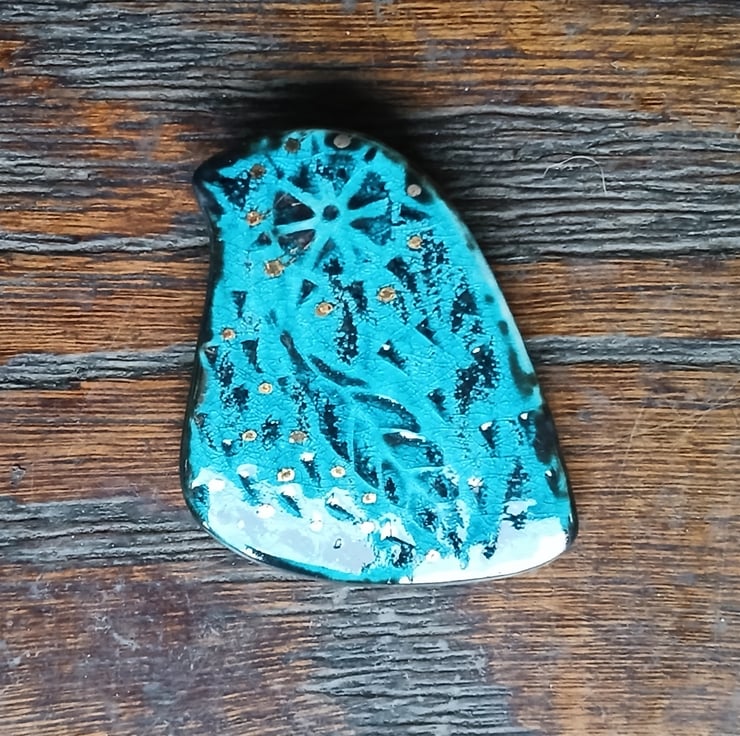 Cut out of white clay then impressed with bird like features .Fired then Glazed in a vibrant turquoise blue glaze then fired again. Gold lustre is applied and fired Measures approximately 8cms in height. Will be carefully packed and posted.