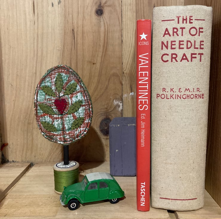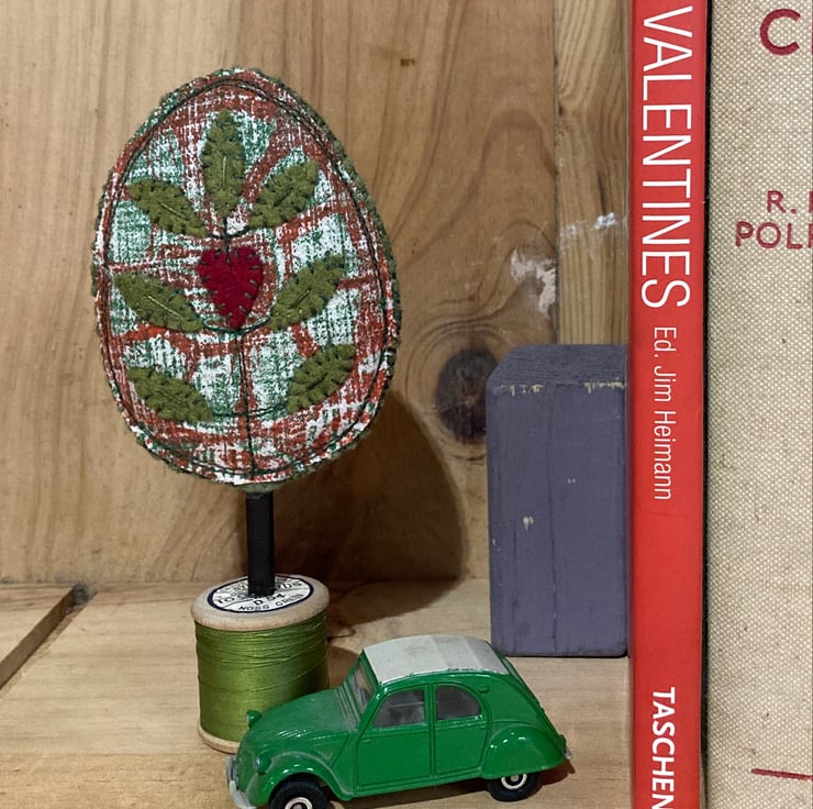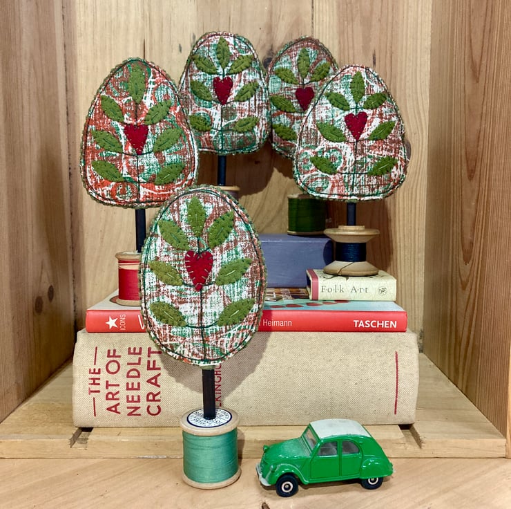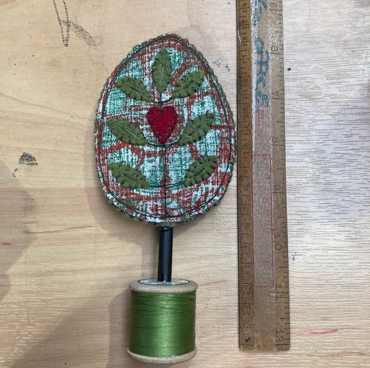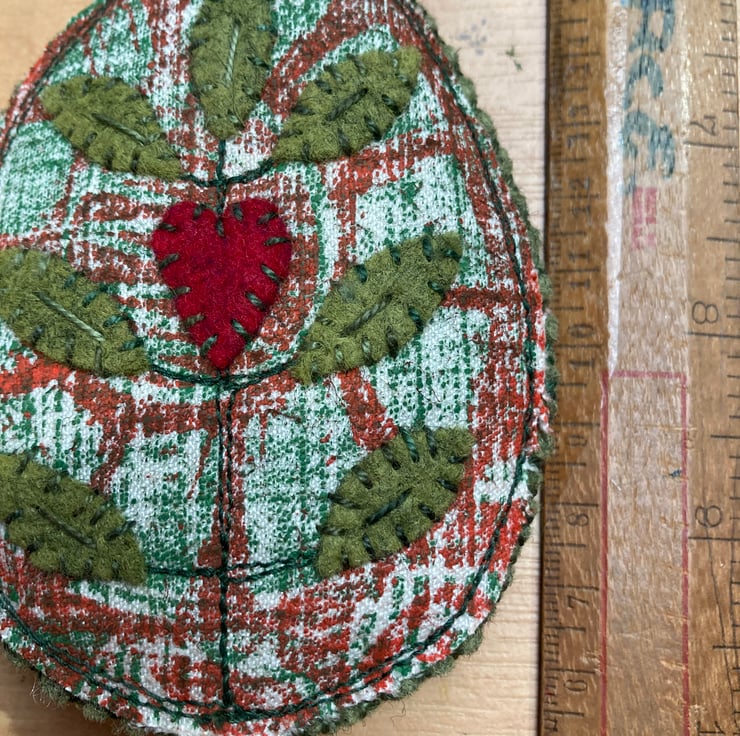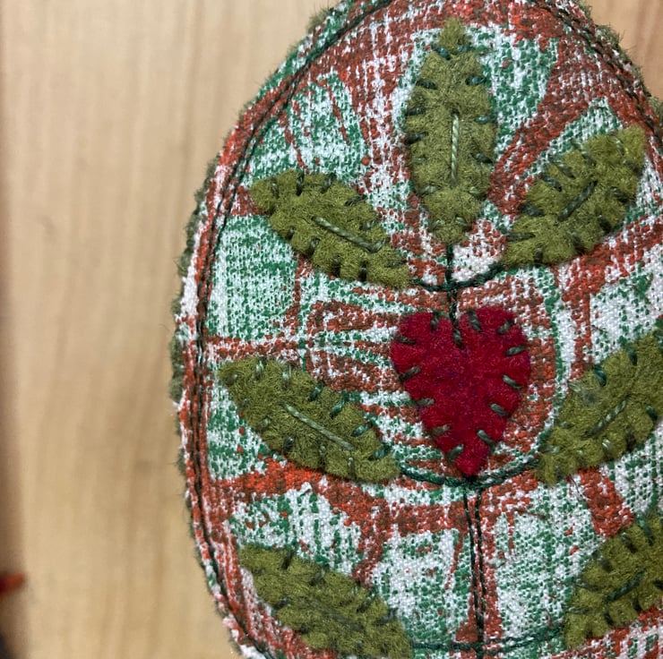 Beautiful printed linen in red and green, with added felt leaves and a little heart.