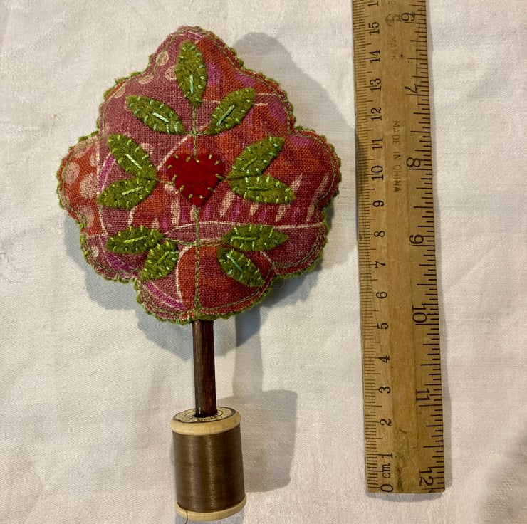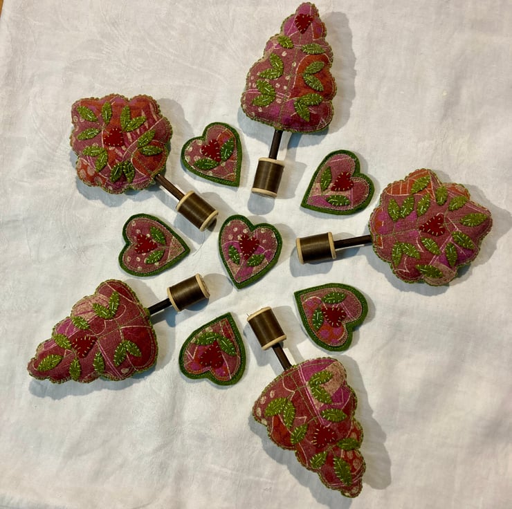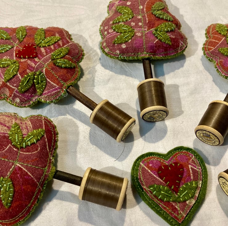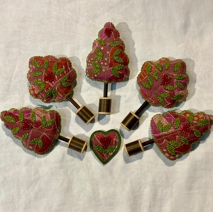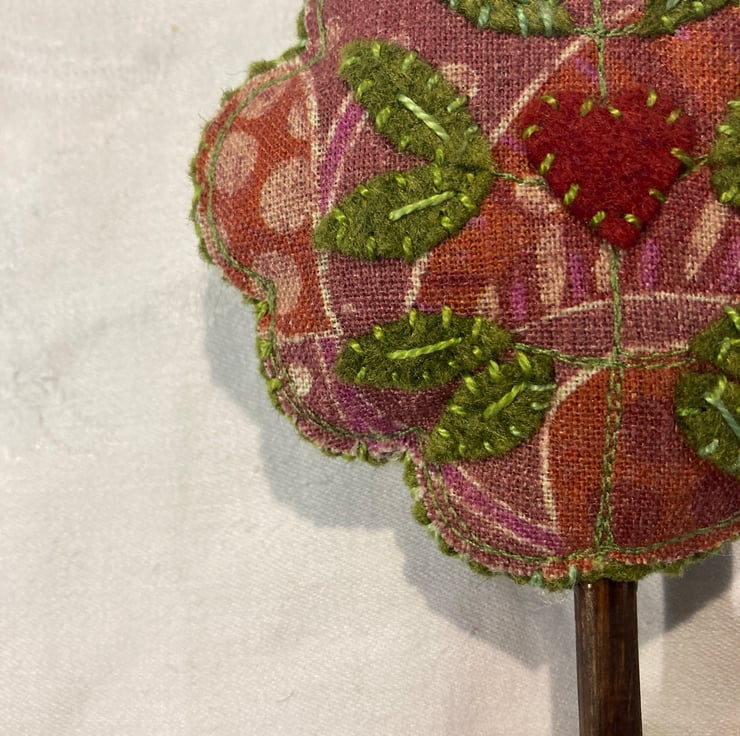 Beautiful printed linen in pinks and reds, with added felt leaves and a little heart.