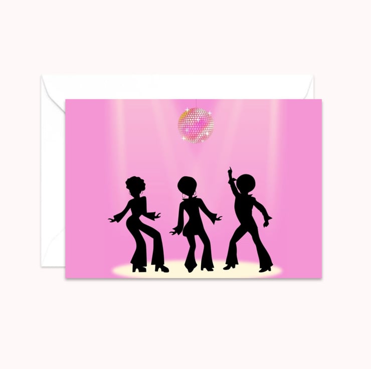 A retro card remembering the disco dancing days of the seventies with flares, platforms, strobe lighting and glitter balls! Printed as a fun, up beat greetings card, to add a dash of pink glitter to any occasion.