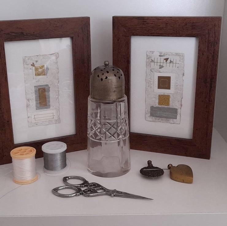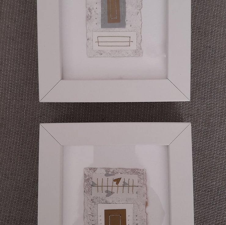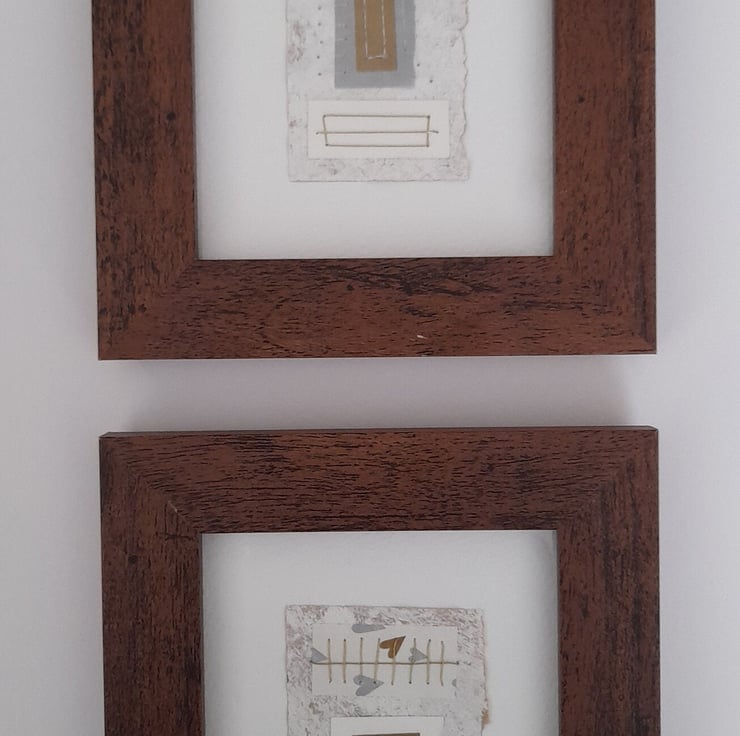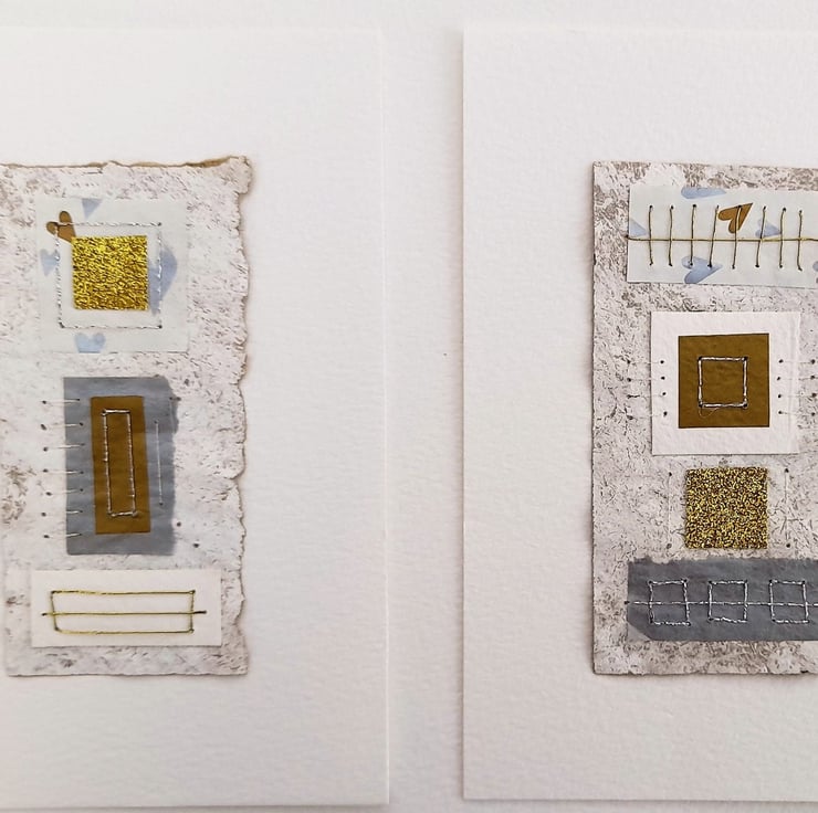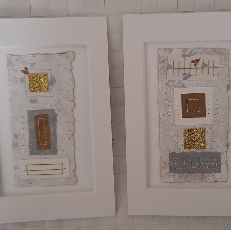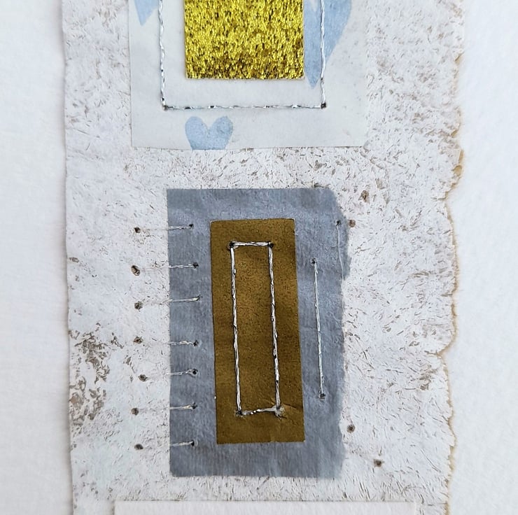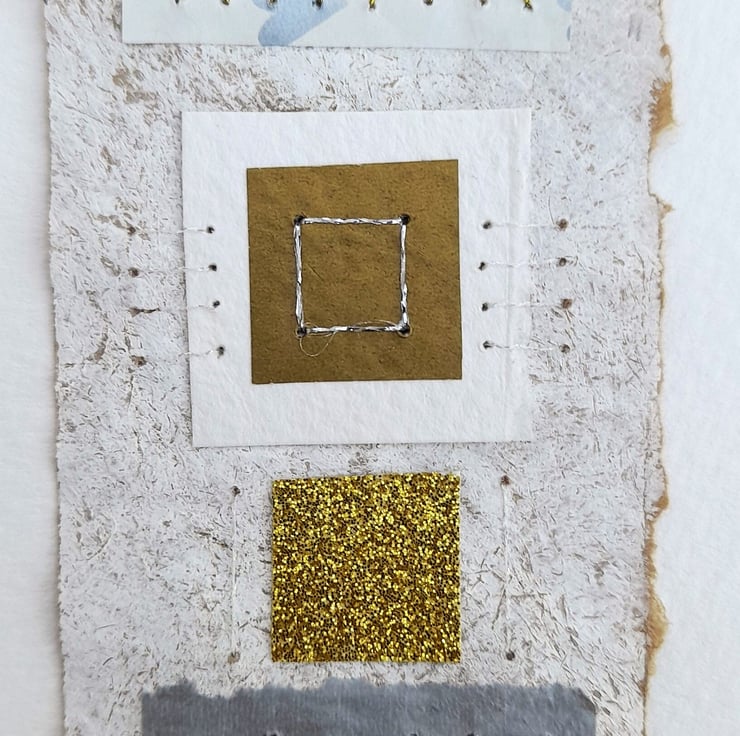 My Squares & Rectangles Shiny Naturals are original handmade mixed media abstract artworks from my Handstitched Geometric Collection. I've used gold & silver heart patterned paper, gold & silver tissue paper, gold metallic paper & white textured paper. I've handstitched over the top to create beautifully simple but really quite interesting little art pieces. The thread compliments the colour combination adding a bit more shimmer & shine. The stitches aren’t meant to be perfect, that's the beauty of the pieces being handmade, they soften the structure of the shapes. The needle markings on the paper add another little bit of interest. Mounted on brown wrapping paper textured with white gouache & acrylic paint & white watercolour paper. Some of the paper’s edges have been torn to emphasize the paper texture.