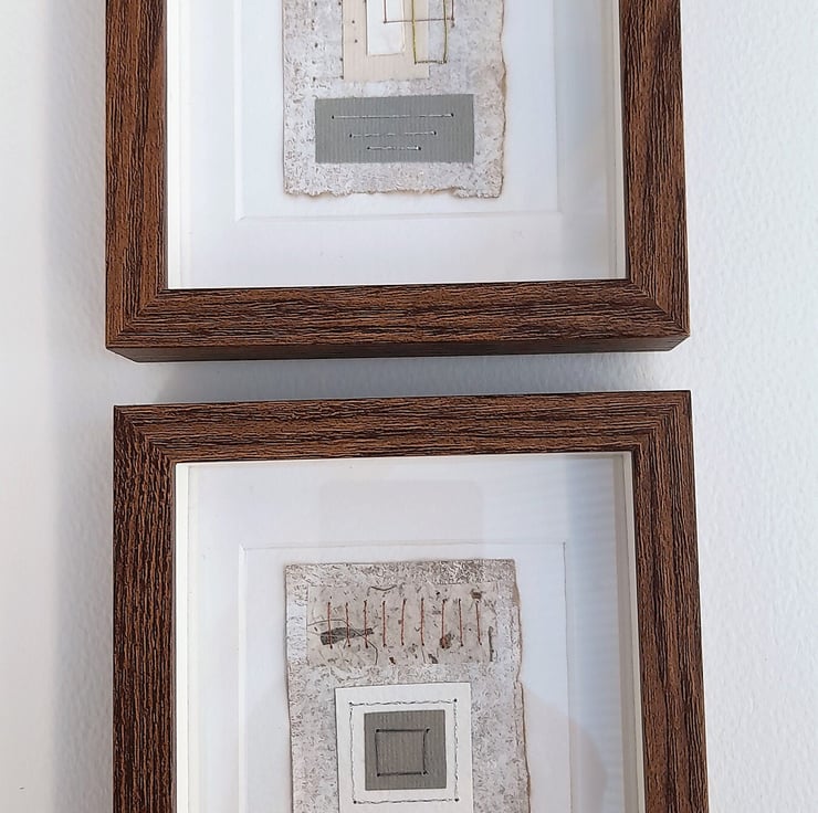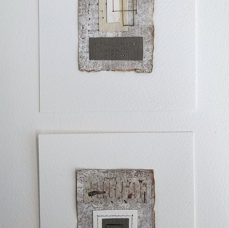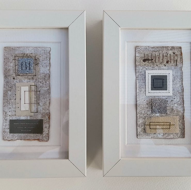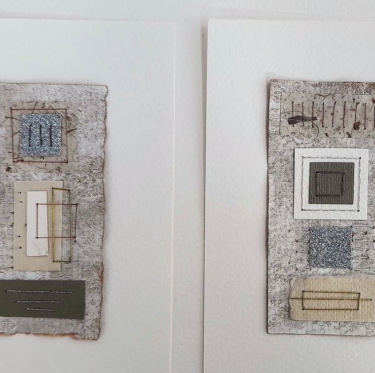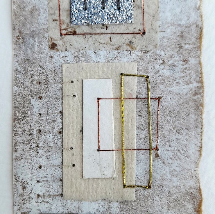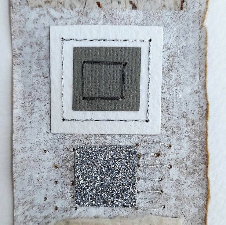 My Squares & Rectangles Shiny Naturals are original handmade mixed media abstract artworks from my Handstitched Geometrics Collection. I've used handmade beige fleck, textured metallic silver, textured paper in grey, silver, white & cream. I've handstitched over the top to create beautifully simple but really quite interesting little art pieces. The thread compliments the colour combination adding a bit more shimmer & shine. The stitches aren’t meant to be perfect, that's the beauty of the pieces being handmade, they soften the structure of the shapes. The needle markings on the paper add another little bit of interest. Mounted on brown wrapping paper textured with white gouache & acrylic paint & white watercolour paper. Some of the paper’s edges have been torn to emphasize the paper texture.