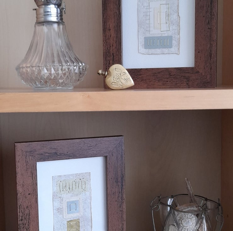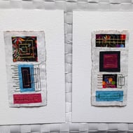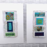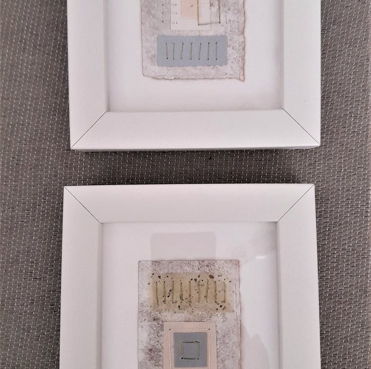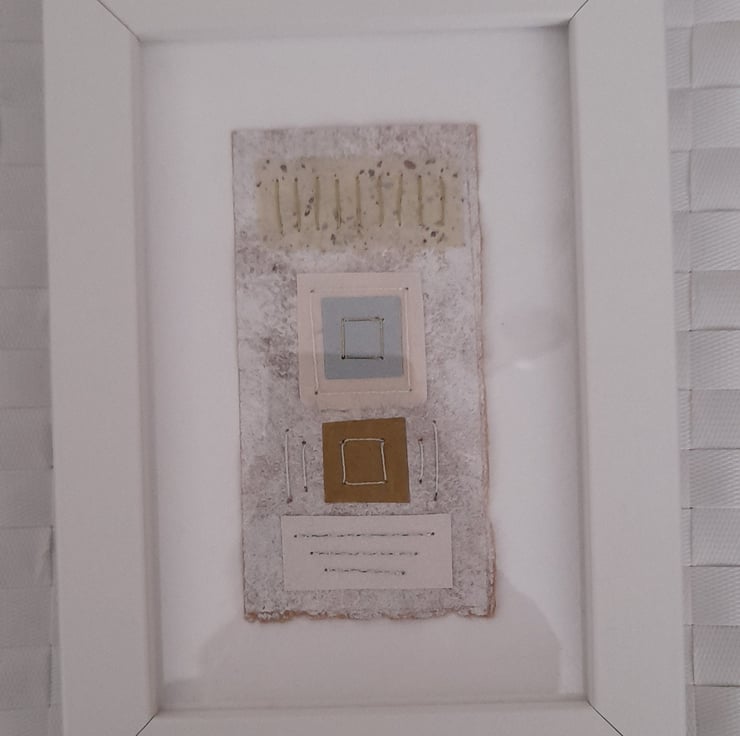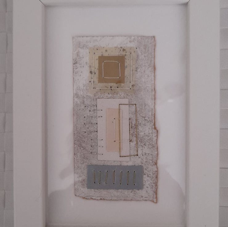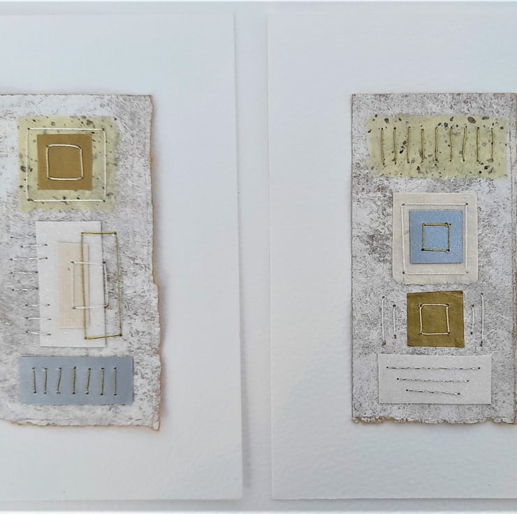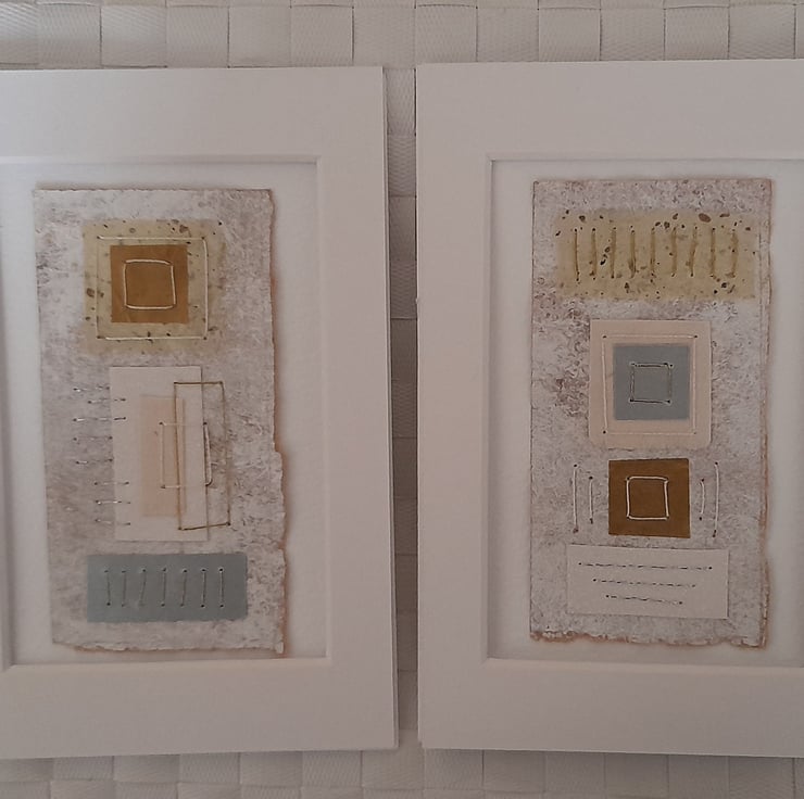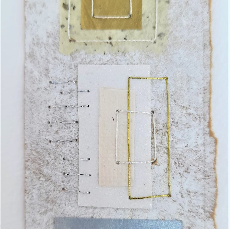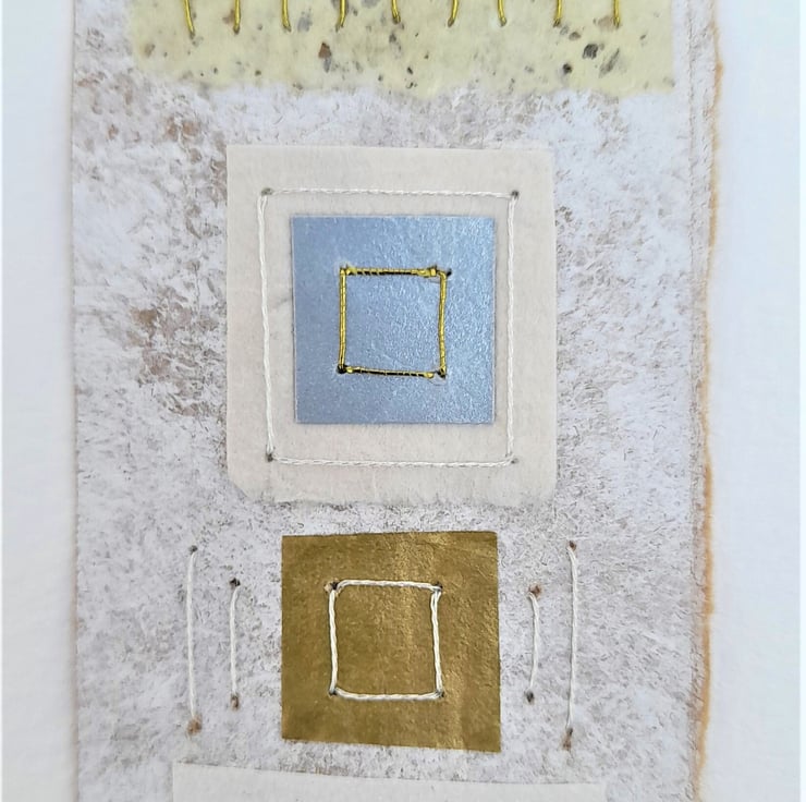 My Squares & Rectangles Shiny Naturals are original handmade mixed media abstract artworks from my Handstitched Geometrics Collection. I've used handmade cream speckled, gold tissue paper, silver paper, textured paper in white & cream. I've handstitched over the top to create beautifully simple but really quite interesting little art pieces. The thread compliments the colour combination adding a bit more shimmer & shine. The stitches aren’t meant to be perfect, that's the beauty of the pieces being handmade, they soften the structure of the shapes. The needle markings on the paper add another little bit of interest. Mounted on brown wrapping paper textured with white gouache & acrylic paint & white watercolour paper. Some of the paper’s edges have been torn to emphasize the paper texture.