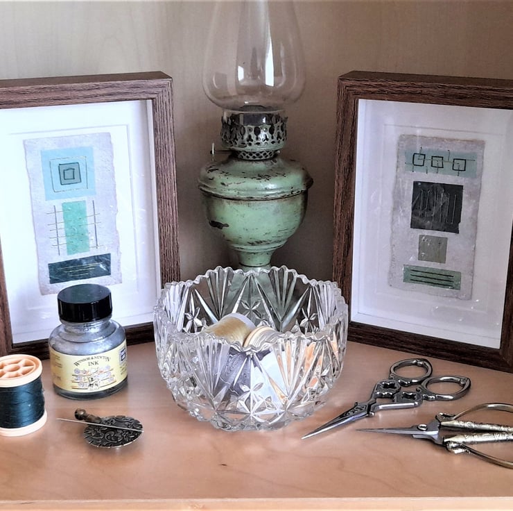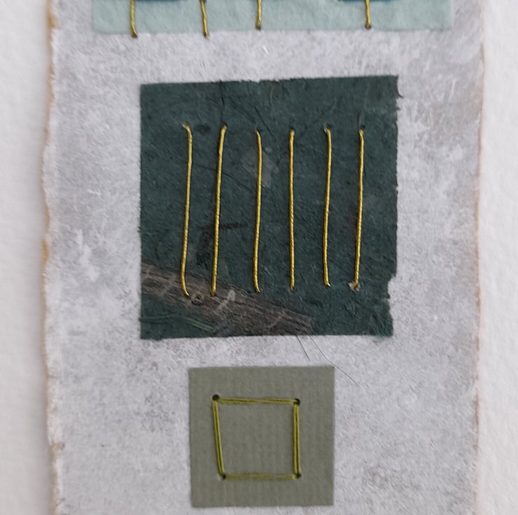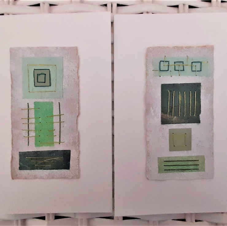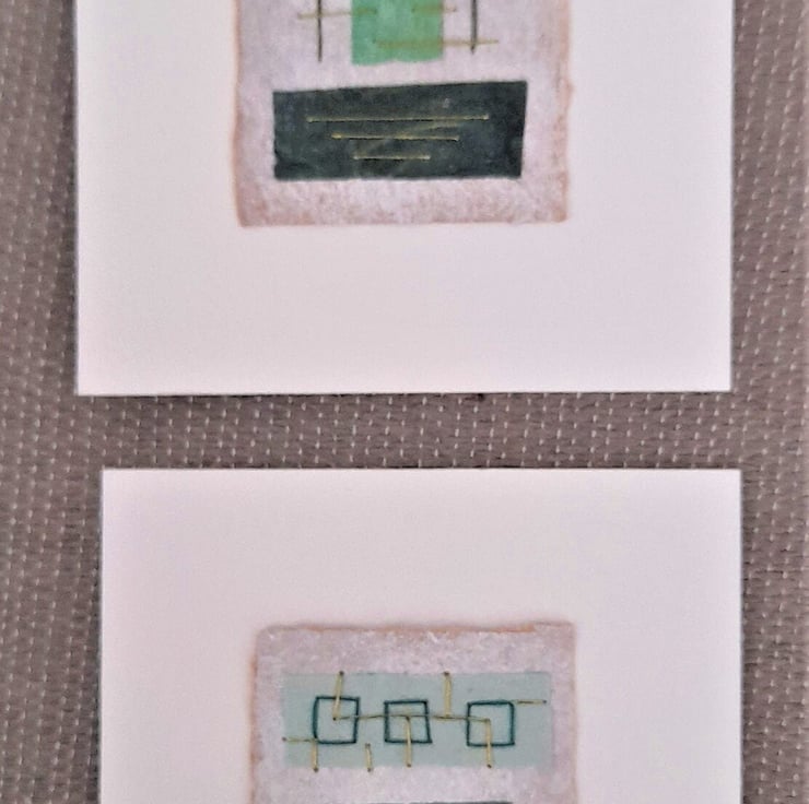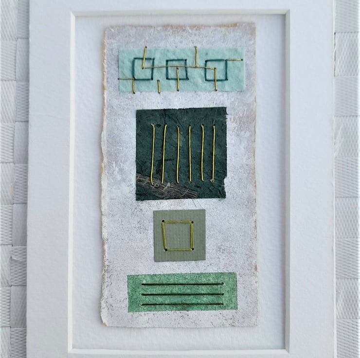 My Colourful Combinations Squares & Rectangles are original handmade mixed media abstract artworks from my Handstitched Geometrics Collection. For this art picture, I've used different types of paper, textured, handmade, tissue in green tones. I've handstitched over the top to create beautifully simple but really quite interesting little art pieces. The thread compliments the colour combination. The stitches aren’t meant to be perfect, that's the beauty of the pieces being handmade, they soften the structure of the shapes. The needle markings on the paper add another little bit of interest. Mounted on brown wrapping paper textured with white gouache & acrylic paint & white watercolour paper. Some of the paper’s edges have been torn to emphasize the paper texture.