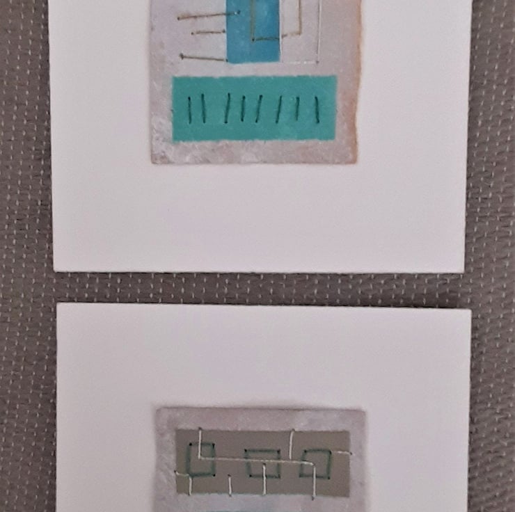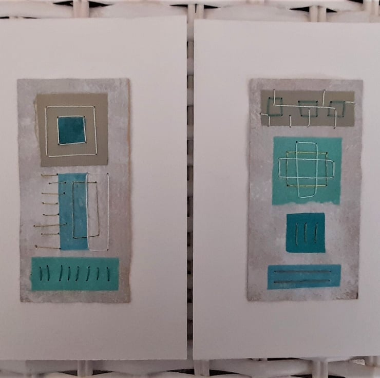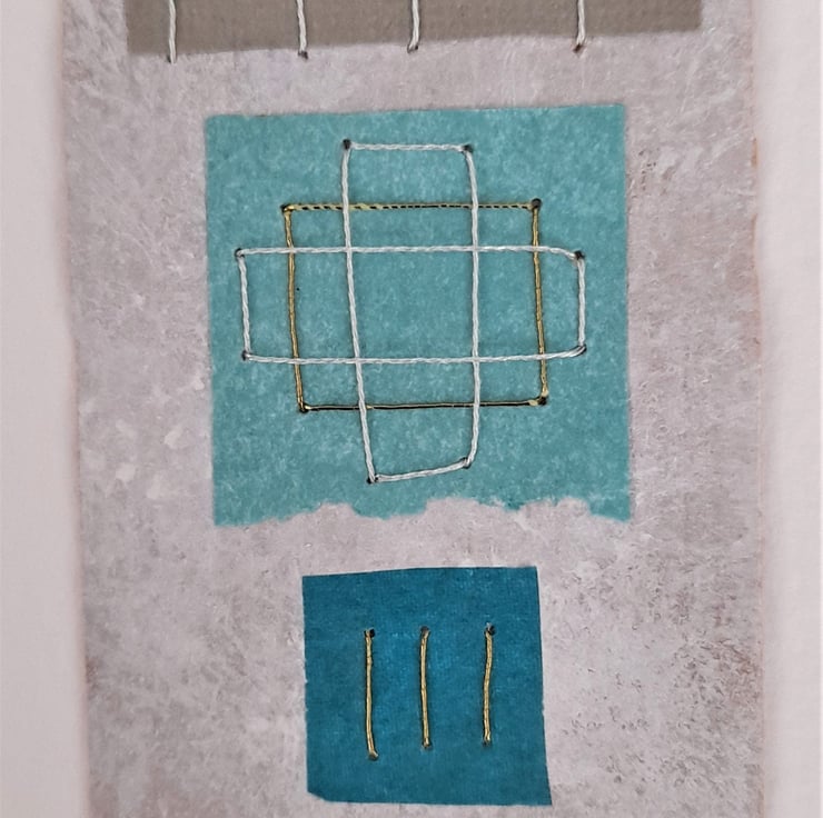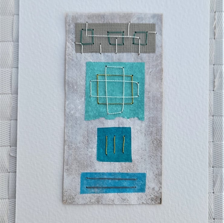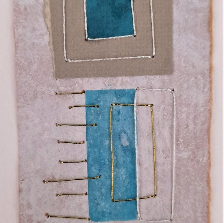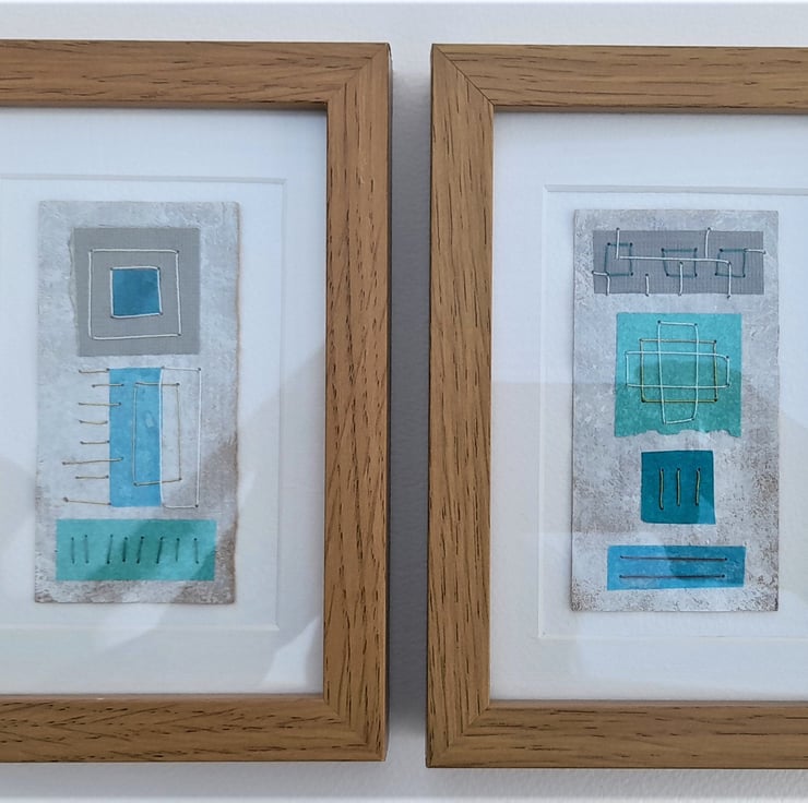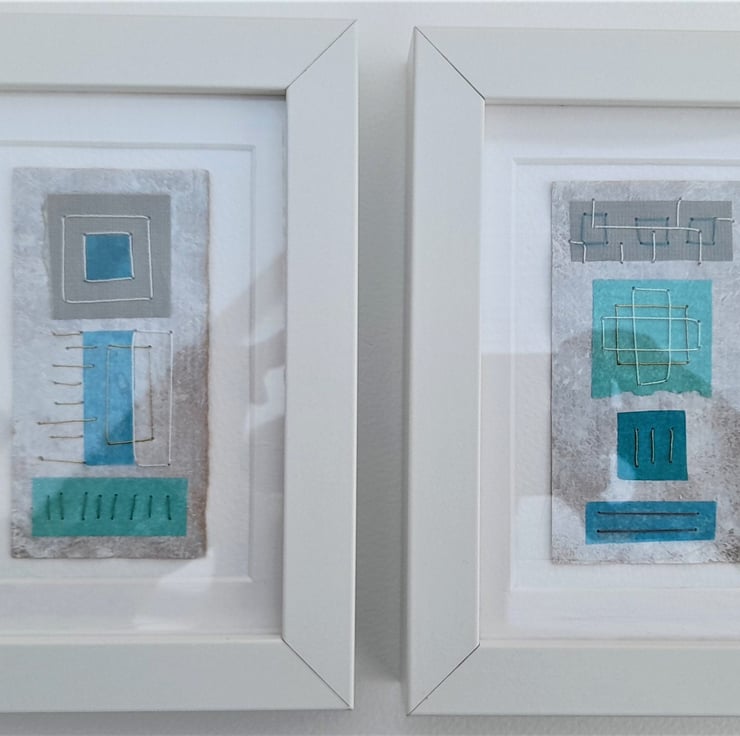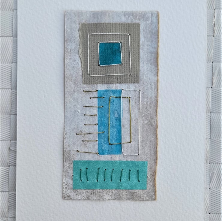 My Colourful Combinations Squares & Rectangles are original handmade mixed media abstract artworks from my Handstitched Geometrics Collection. For this art picture, I've used different types of paper, textured, handmade, tissue in grey & turquoise. I've handstitched over the top to create beautifully simple but really quite interesting little art pieces. The thread compliments the colour combination. The stitches aren’t meant to be perfect, that's the beauty of the pieces being handmade, they soften the structure of the shapes. The needle markings on the paper add another little bit of interest. Mounted on brown wrapping paper textured with white gouache & acrylic paint & white watercolour paper. Some of the paper’s edges have been torn to emphasize the paper texture.