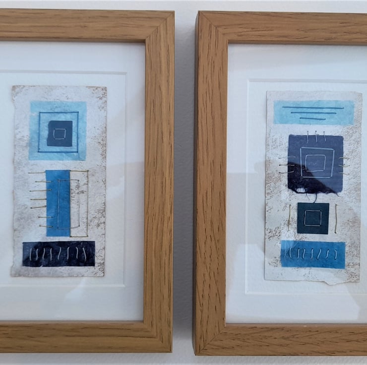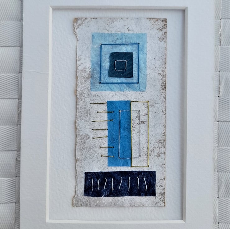 My Colourful Combinations Squares & Rectangles are original handmade mixed media abstract artworks from my Handstitched Geometrics Collection. For this art picture, I've used different types of paper, textured, handmade, tissue in blue tones. I've handstitched over the top to create beautifully simple but really quite interesting little art pieces. The thread compliments the colour combination. The stitches aren’t meant to be perfect, that's the beauty of the pieces being handmade, they soften the structure of the shapes. The needle markings on the paper add another little bit of interest. Mounted on brown wrapping paper textured with white gouache & acrylic paint & white watercolour paper. Some of the paper’s edges have been torn to emphasize the paper texture.