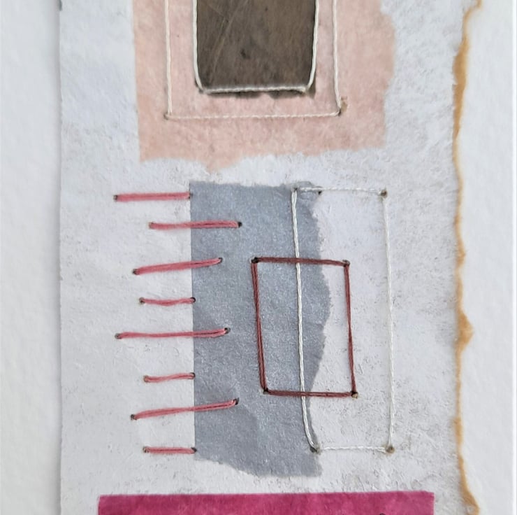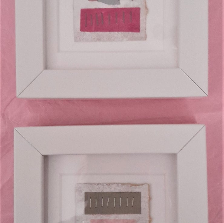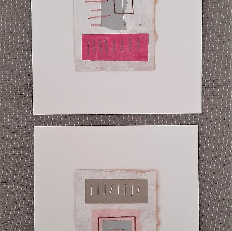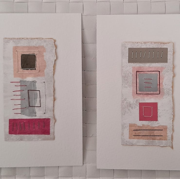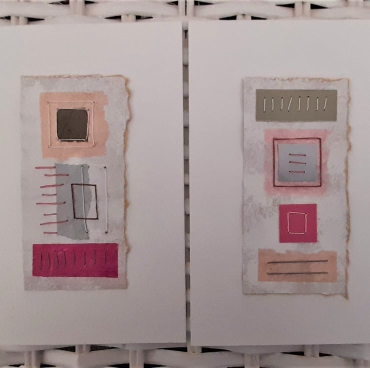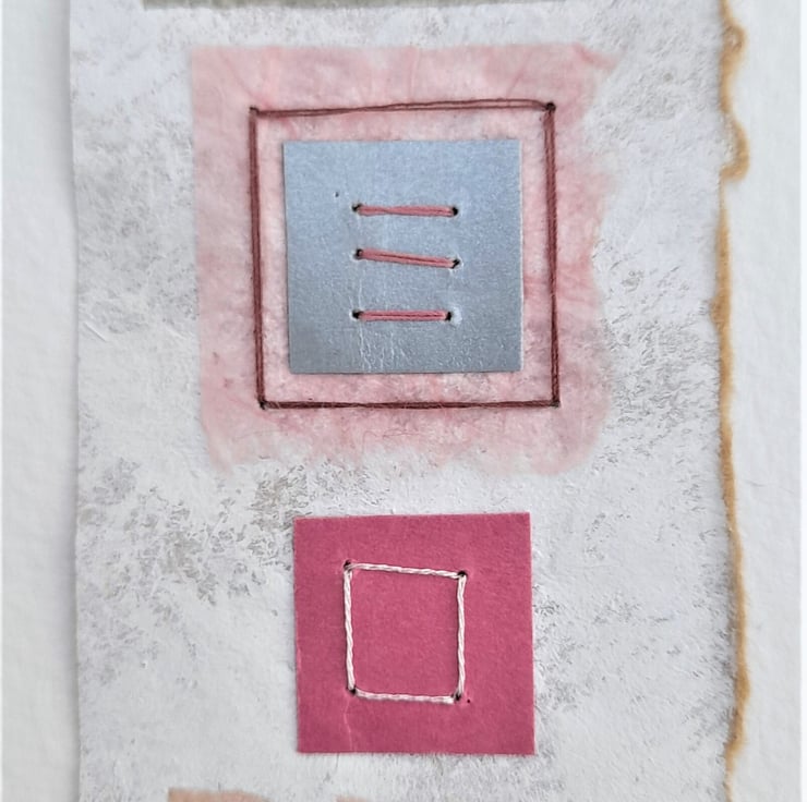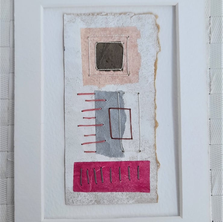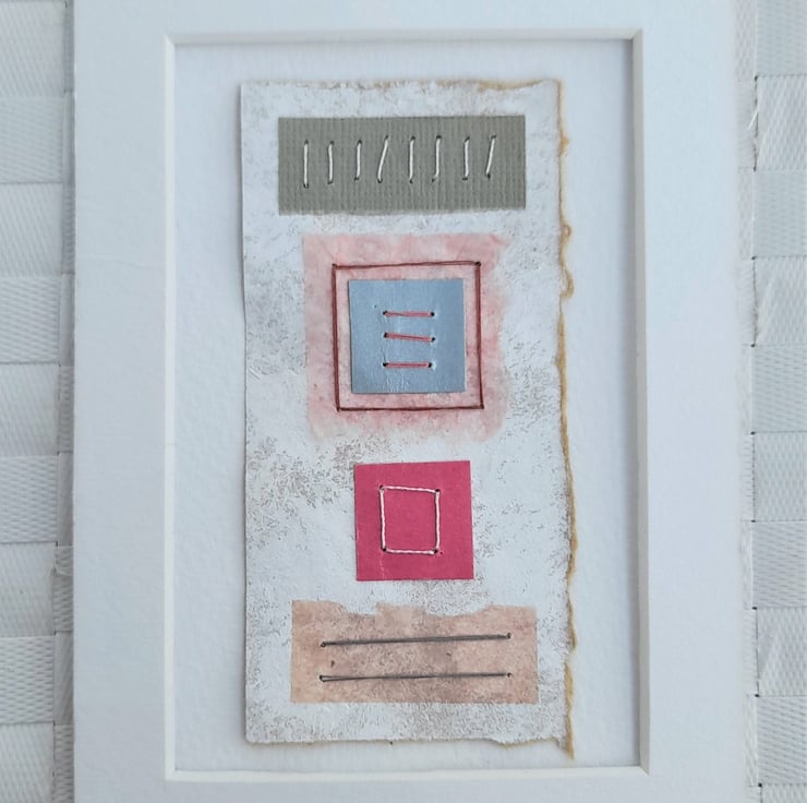 My Colourful Combinations Squares & Rectangles are original handmade mixed media abstract artworks from my Geometrics Collection. For this art picture, I've used different types of paper, textured, handmade, tissue in grey & pink. I've handstitched over the top to create beautifully simple but really quite interesting little art pieces. The thread compliments the colour combination. The stitches aren’t meant to be perfect, that's the beauty of the pieces being handmade, they soften the structure of the shapes. The needle markings on the paper add another little bit of interest. Mounted on brown wrapping paper textured with white gouache & acrylic paint & white watercolour paper. Some of the paper’s edges have been torn to emphasize the paper texture.