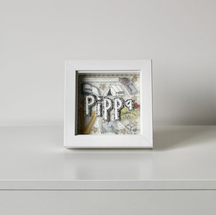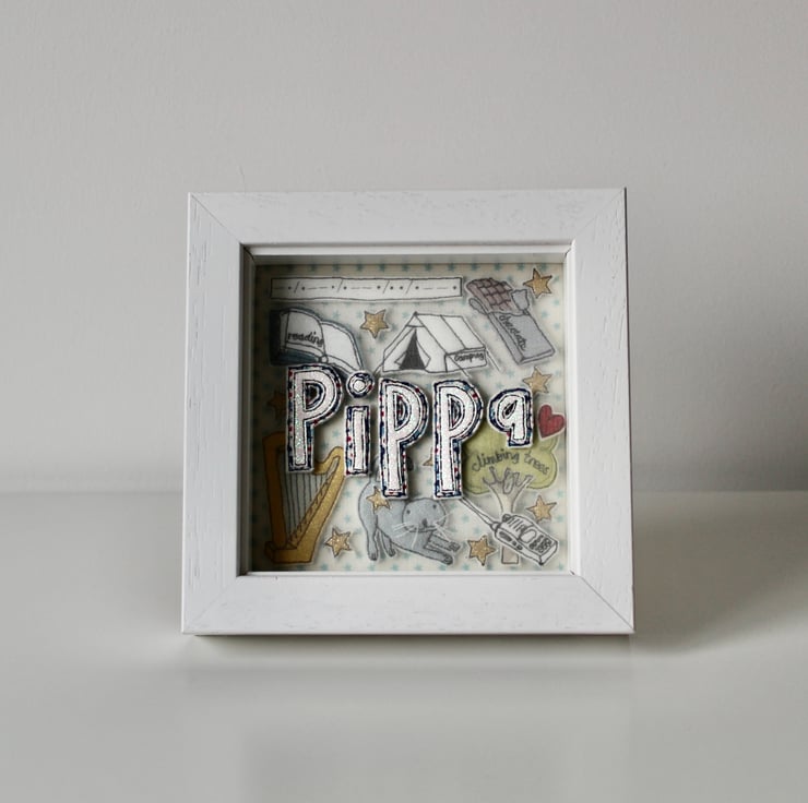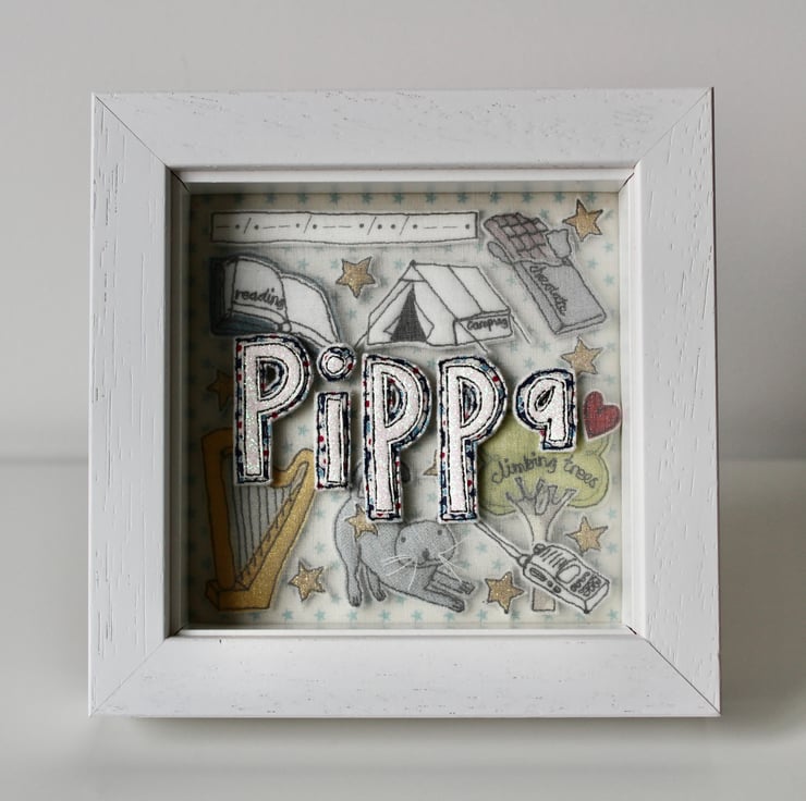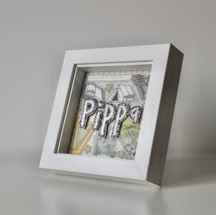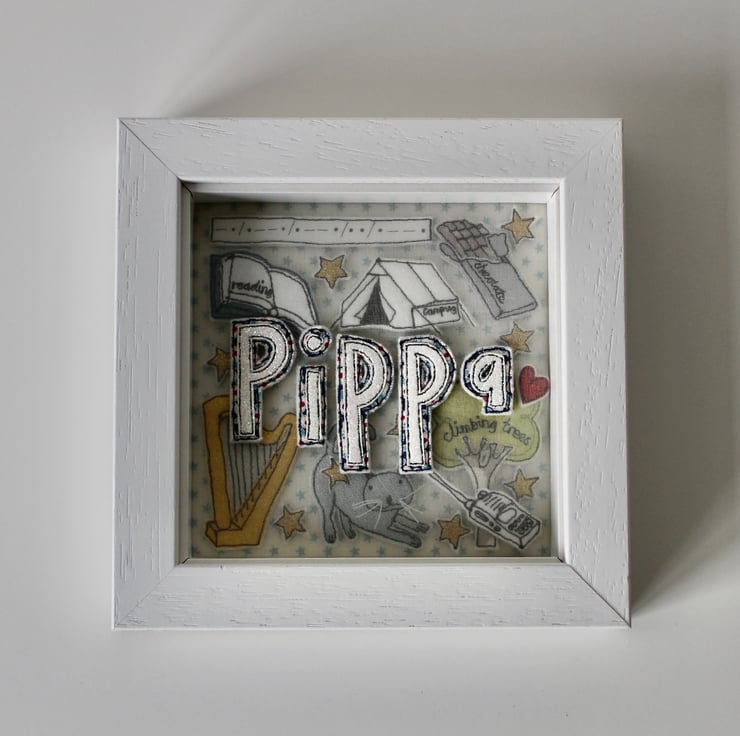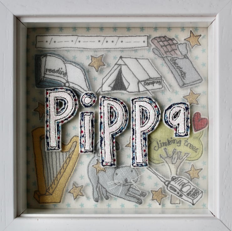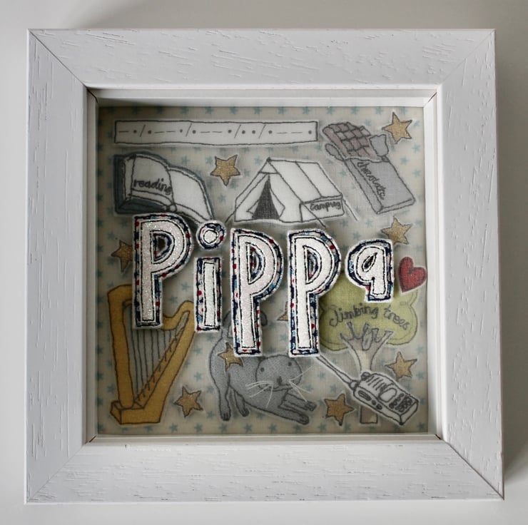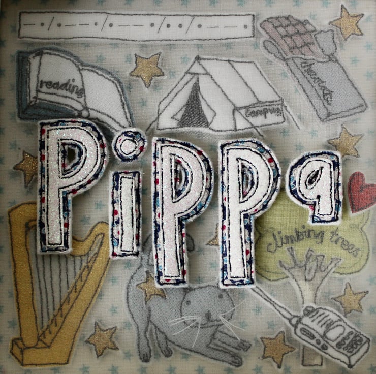 Pippa's name, the book, tent, bar of chocolate, harp, cat, tree, walkie-talkie, stars and Morse code are all created using layers of cloth and free hand machine embroidery. Each is cut out by hand using a very sharp pair of scissors.